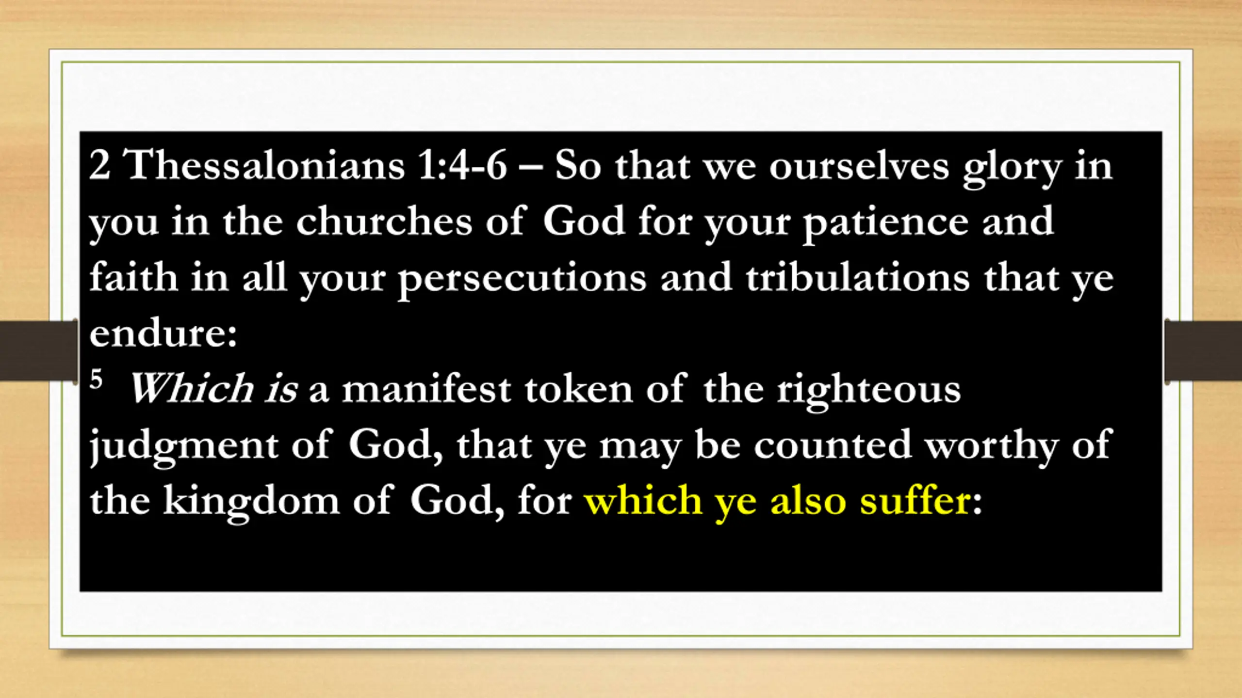 2 Thessalonians 1:4-6 So that we ourselves glory in you in the churches of God for your patience and faith in all your persecutions and tribulations that ye endure: 5 Which is a manifest token of the righteous judgment of God, that ye may be counted worthy of the kingdom of God, for which ye also suffer:
