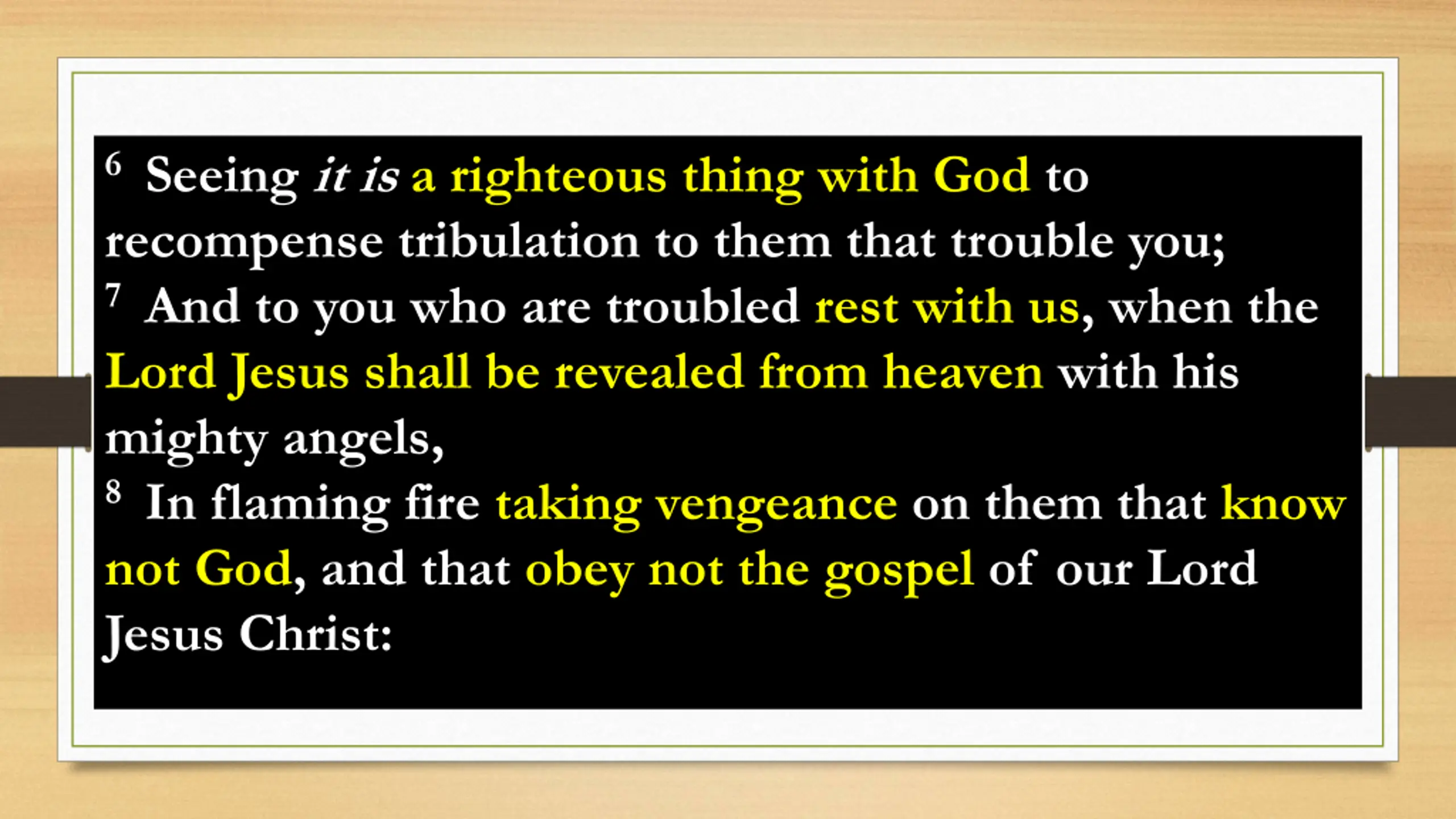 6 Seeing it is a righteous thing with God to recompense tribulation to them that trouble you; 7 And to you who are troubled rest with us, when the Lord Jesus shall be revealed from heaven with his mighty angels, 8 In flaming fire taking vengeance on them that know not God, and that obey not the gospel of our Lord Jesus Christ: