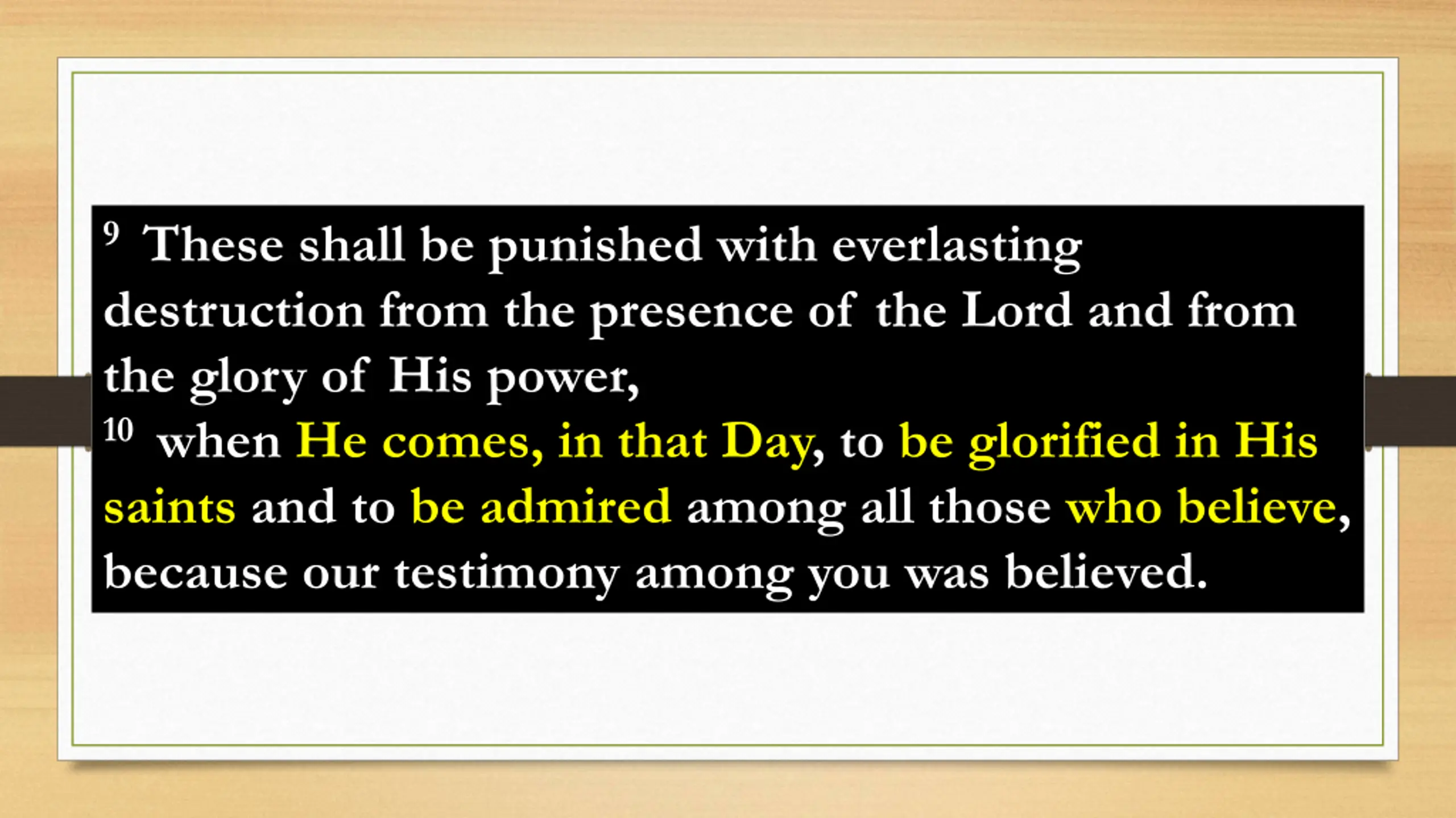 9 These shall be punished with everlasting destruction from the presence of the Lord and from the glory of His power, 10 when He comes, in that Day, to be glorified in His saints and to be admired among all those who believe, because our testimony among you was believed.