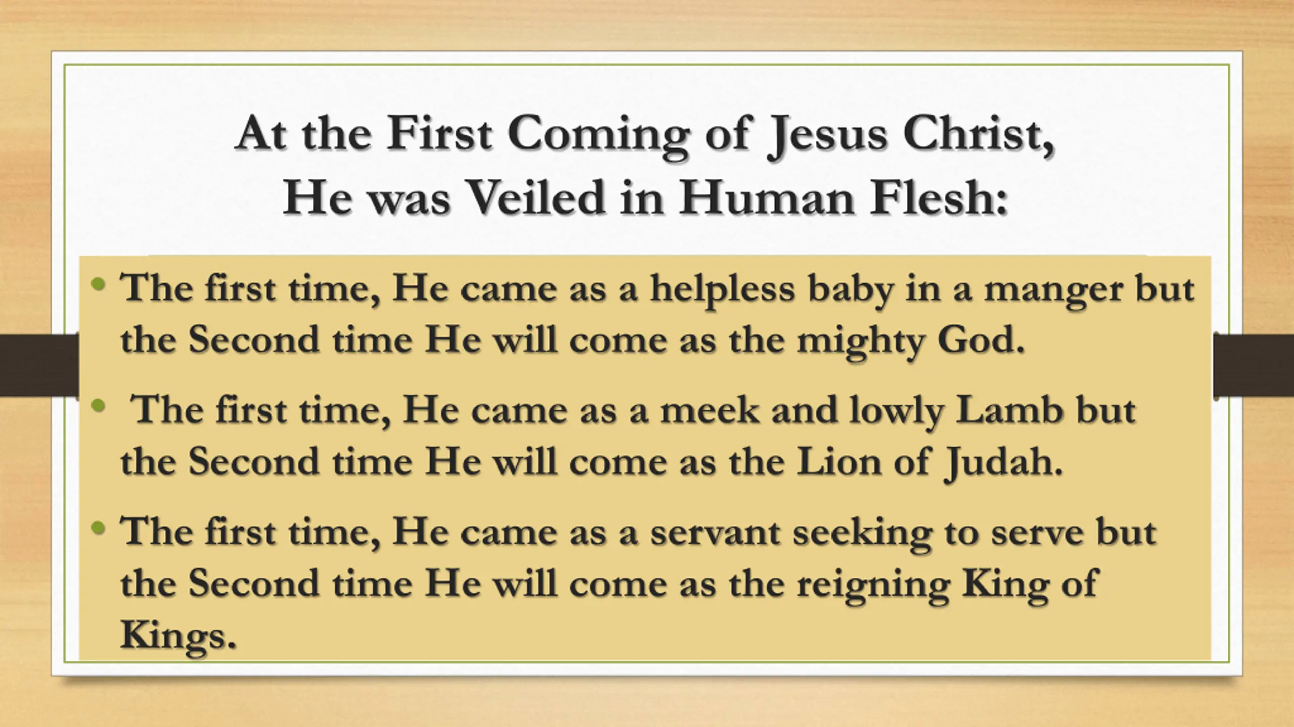 At the First Coming of Jesus Christ, He was Veiled in Human Flesh: The first time, He came as a helpless baby in a manger but the Second time He will come as the mighty God. The first time, He came as a meek and lowly Lamb but the Second time He will come as the Lion of Judah. The first time, He came as a servant seeking to serve but the Second time He will come as the reigning King of Kings.