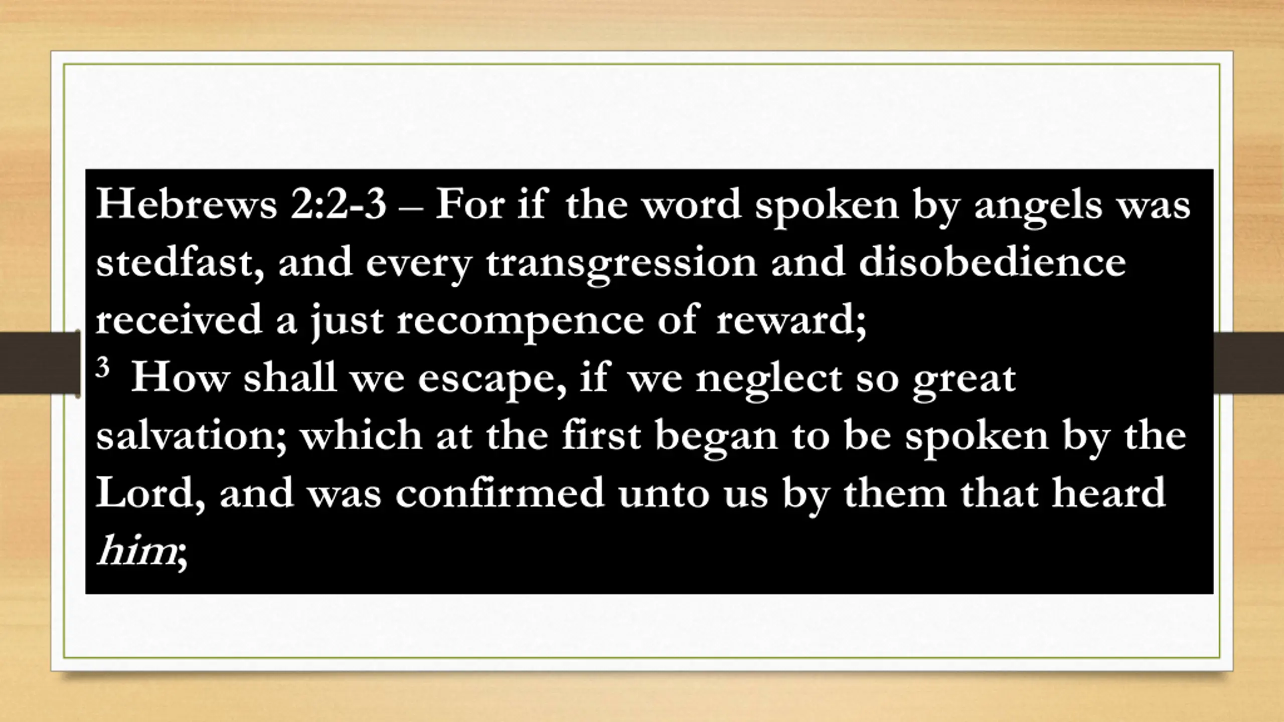 Hebrews 2:2-3 For if the word spoken by angels was stedfast, and every transgression and disobedience received a just recompence of reward; 3 How shall we escape, if we neglect so great salvation; which at the first began to be spoken by the Lord, and was confirmed unto us by them that heard him;