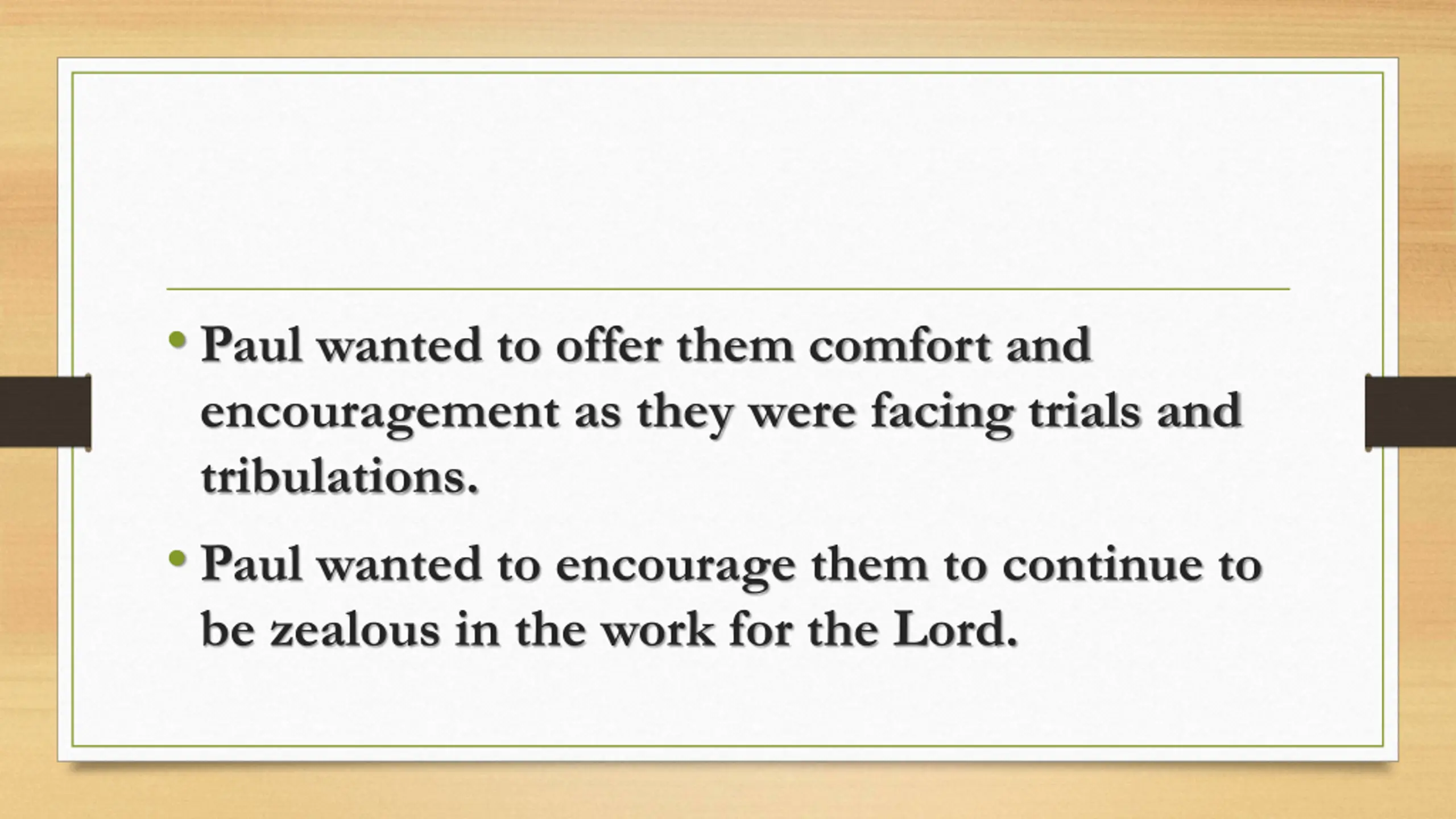 Paul wanted to offer them comfort and encouragement as they were facing trials and tribulations. Paul wanted to encourage them to continue to be zealous in the work for the Lord.