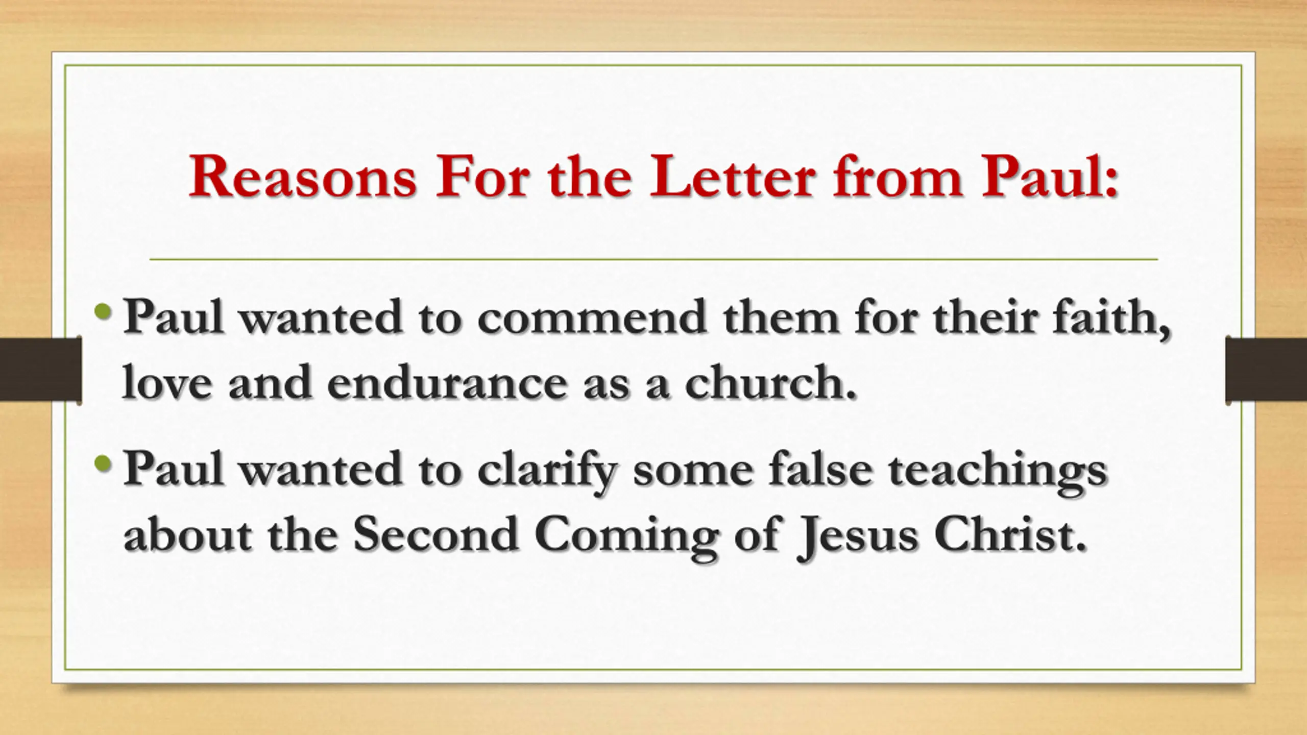 Reasons For the Letter from Paul: Paul wanted to commend them for their faith, love and endurance as a church. Paul wanted to clarify some false teachings about the Second Coming of Jesus Christ.