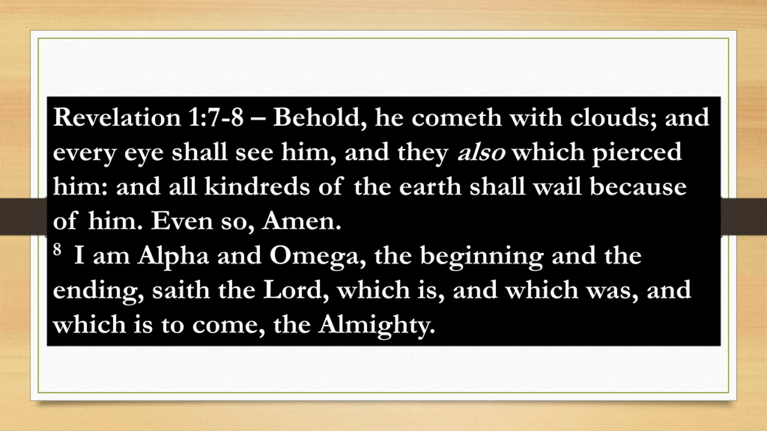 Revelation 1:7-8 Behold, he cometh with clouds; and every eye shall see him, and they also which pierced him: and all kindreds of the earth shall wail because of him. Even so, Amen. 8 I am Alpha and Omega, the beginning and the ending, saith the Lord, which is, and which was, and which is to come, the Almighty.