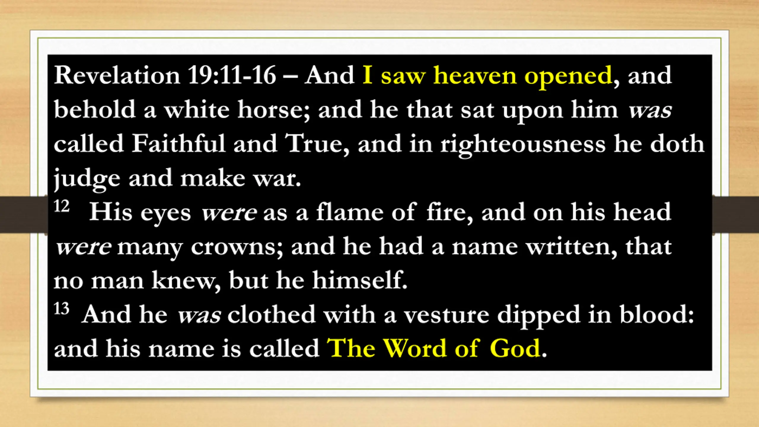 Revelation 19:11-16 And I saw heaven opened, and behold a white horse; and he that sat upon him was called Faithful and True, and in righteousness he doth judge and make war. 12 His eyes were as a flame of fire, and on his head were many crowns; and he had a name written, that no man knew, but he himself. 13 And he was clothed with a vesture dipped in blood: and his name is called The Word of God.