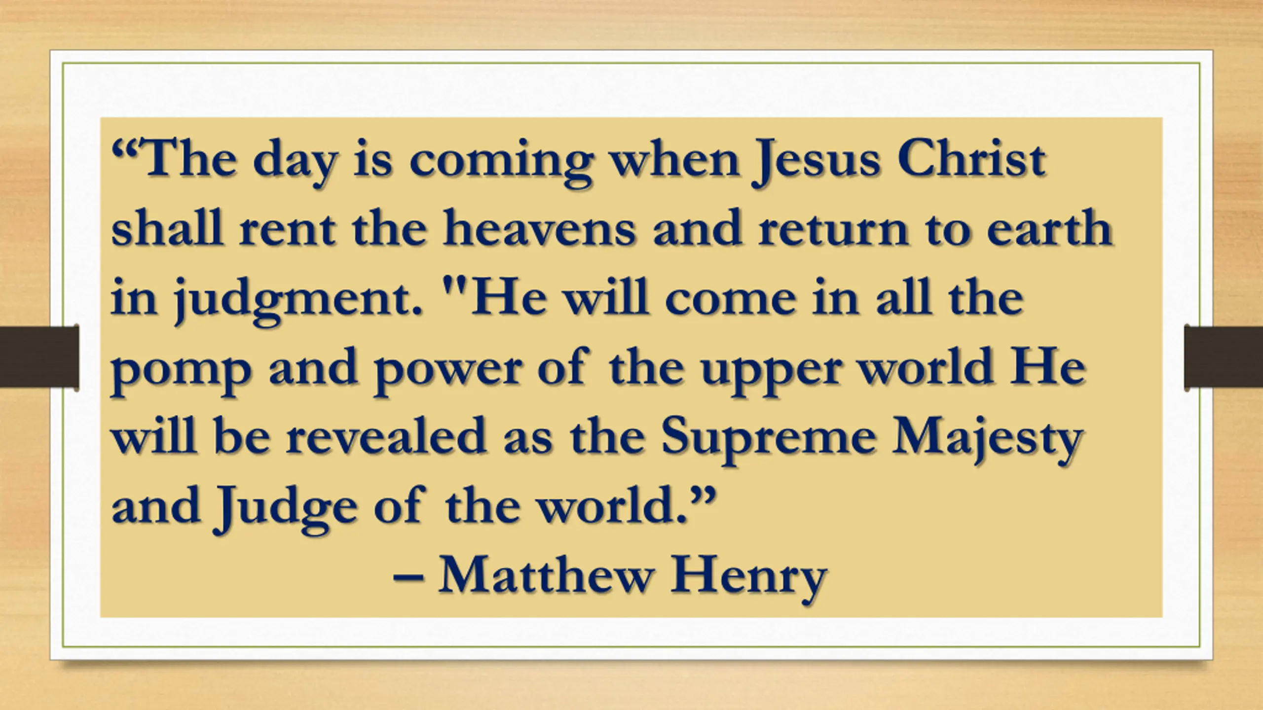 The day is coming when Jesus Christ shall rent the heavens and return to earth in judgment. "He will come in all the pomp and power of the upper world He will be revealed as the Supreme Majesty and Judge of the world. Matthew Henry