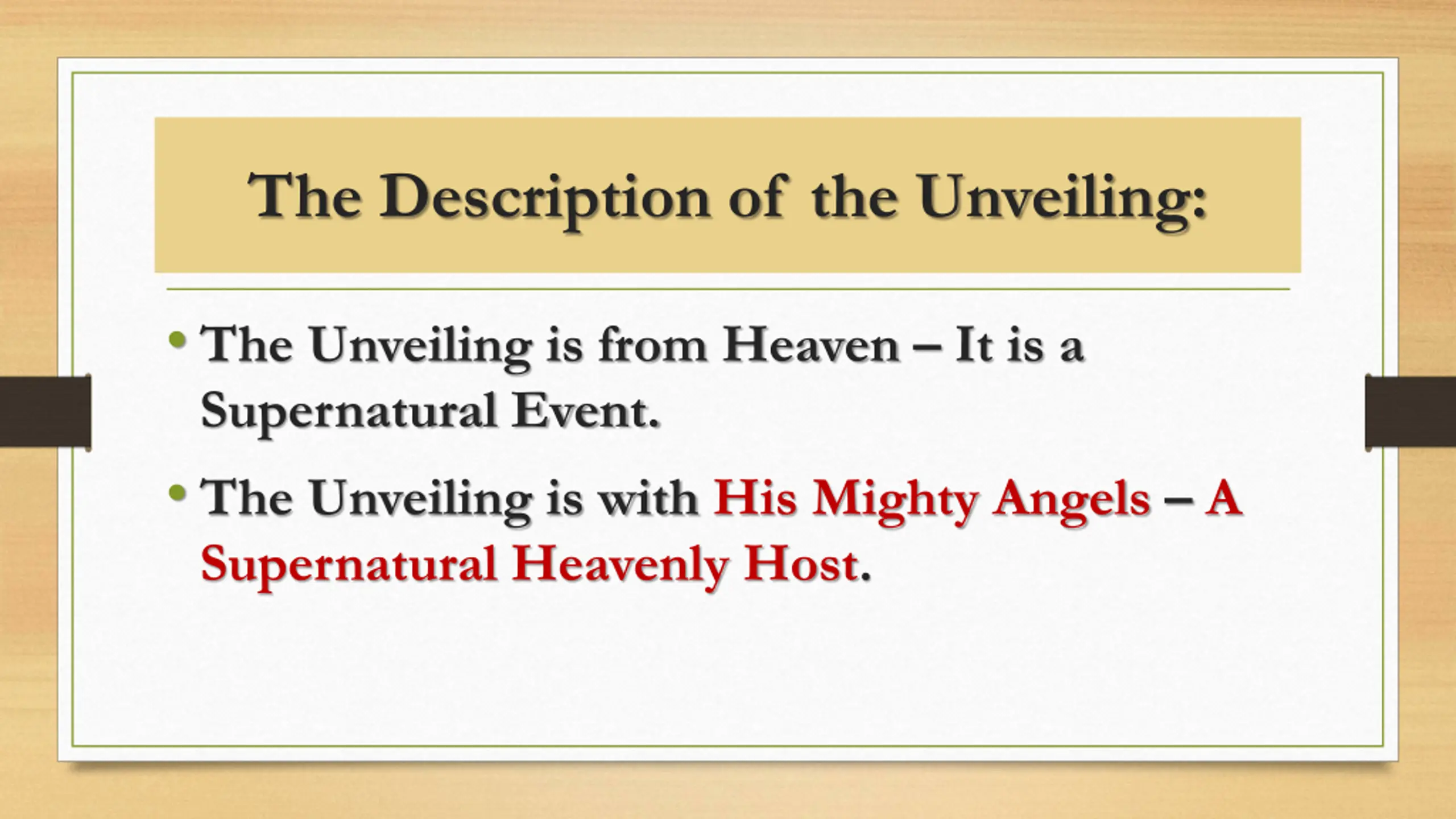The Description of the Unveiling: The Unveiling is from Heaven It is a Supernatural Event. The Unveiling is with His Mighty Angels A Supernatural Heavenly Host.