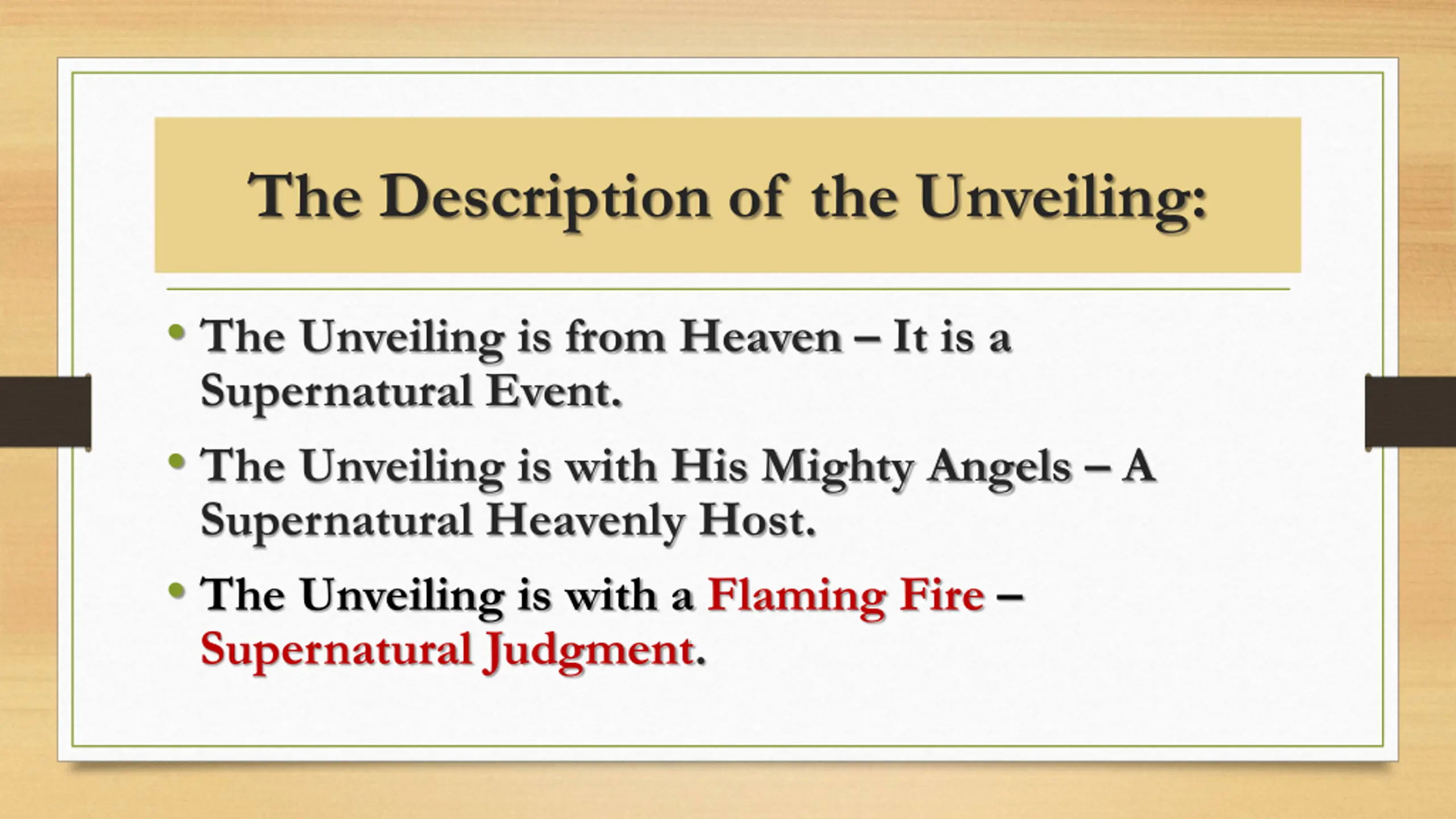 The Description of the Unveiling: The Unveiling is from Heaven It is a Supernatural Event. The Unveiling is with His Mighty Angels A Supernatural Heavenly Host. The Unveiling is with a Flaming Fire Supernatural Judgment.