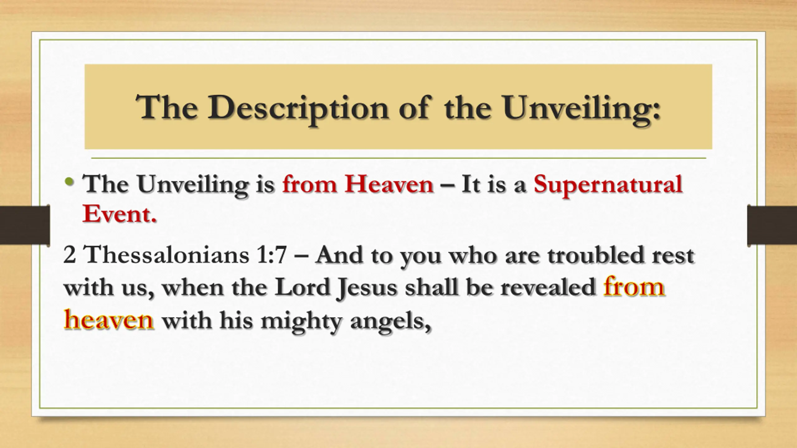 The Description of the Unveiling: The Unveiling is from Heaven It is a Supernatural Event. 2 Thessalonians 1:7 And to you who are troubled rest with us, when the Lord Jesus shall be revealed from heaven with his mighty angels,