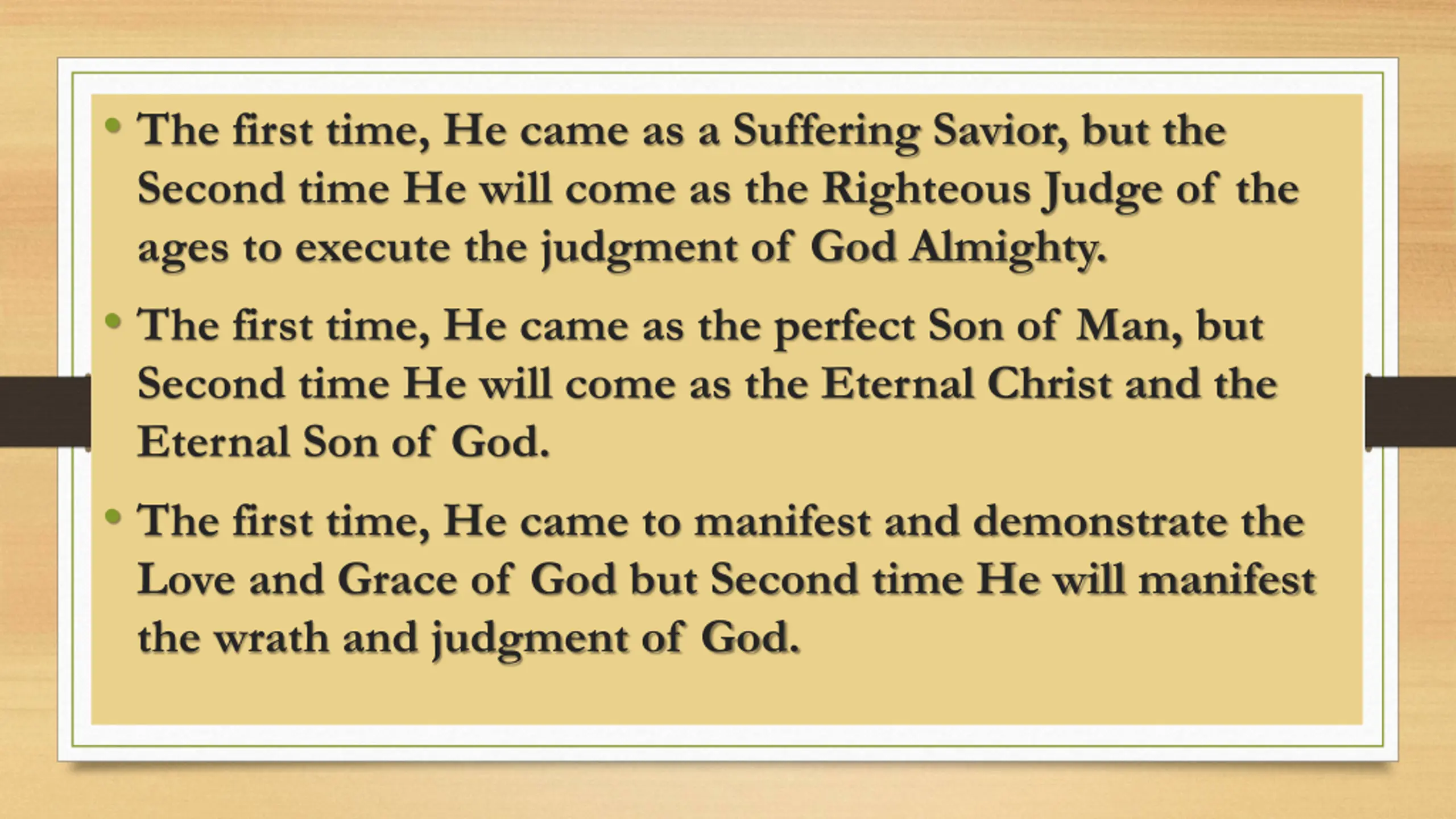 The first time, He came as a Suffering Savior, but the Second time He will come as the Righteous Judge of the ages to execute the judgment of God Almighty. The first time, He came as the perfect Son of Man, but Second time He will come as the Eternal Christ and the Eternal Son of God. The first time, He came to manifest and demonstrate the Love and Grace of God but Second time He will manifest the wrath and judgment of God.