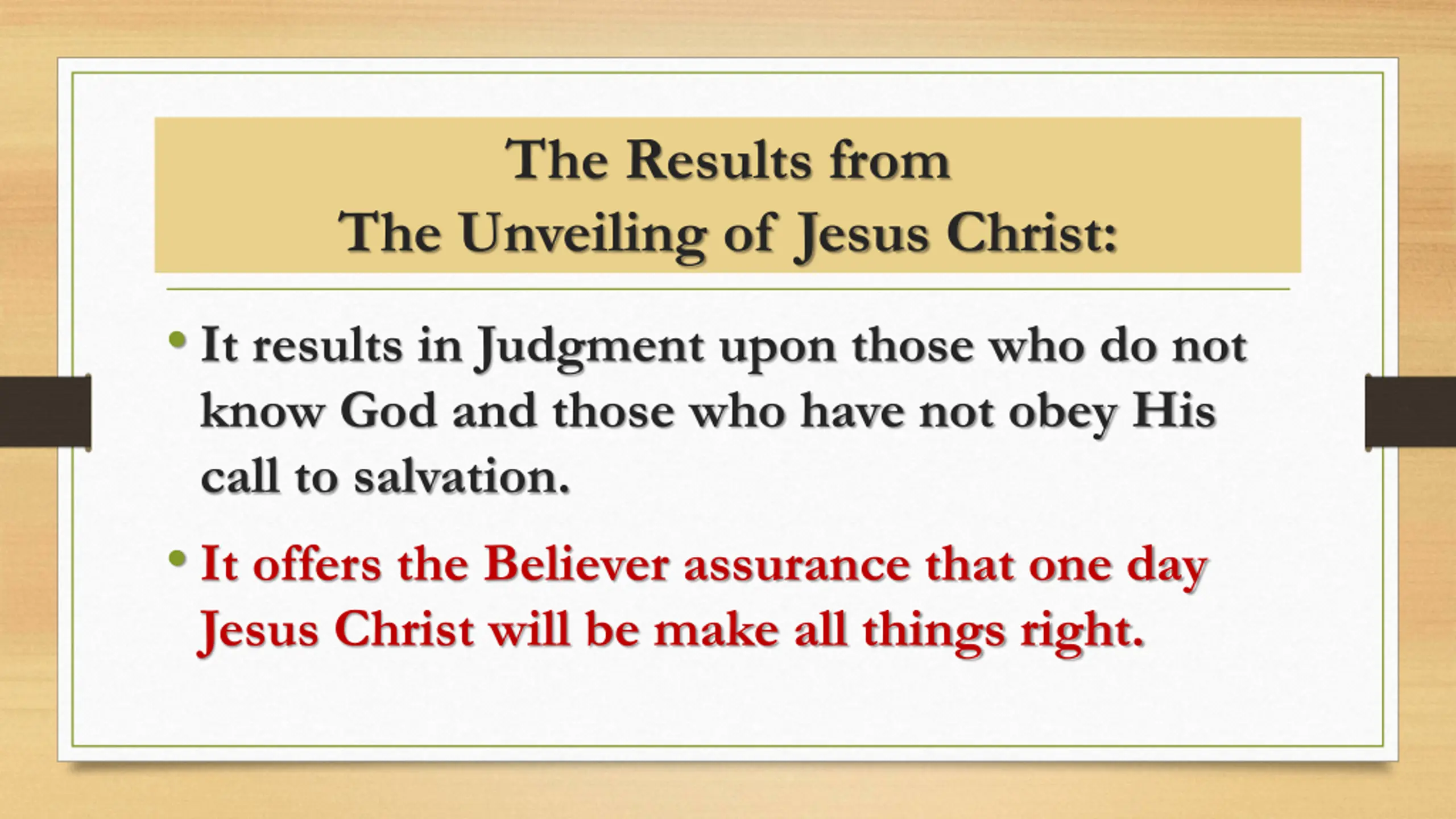 The Results from The Unveiling of Jesus Christ: It results in Judgment upon those who do not know God and those who have not obey His call to salvation. It offers the Believer assurance that one day Jesus Christ will be make all things right.