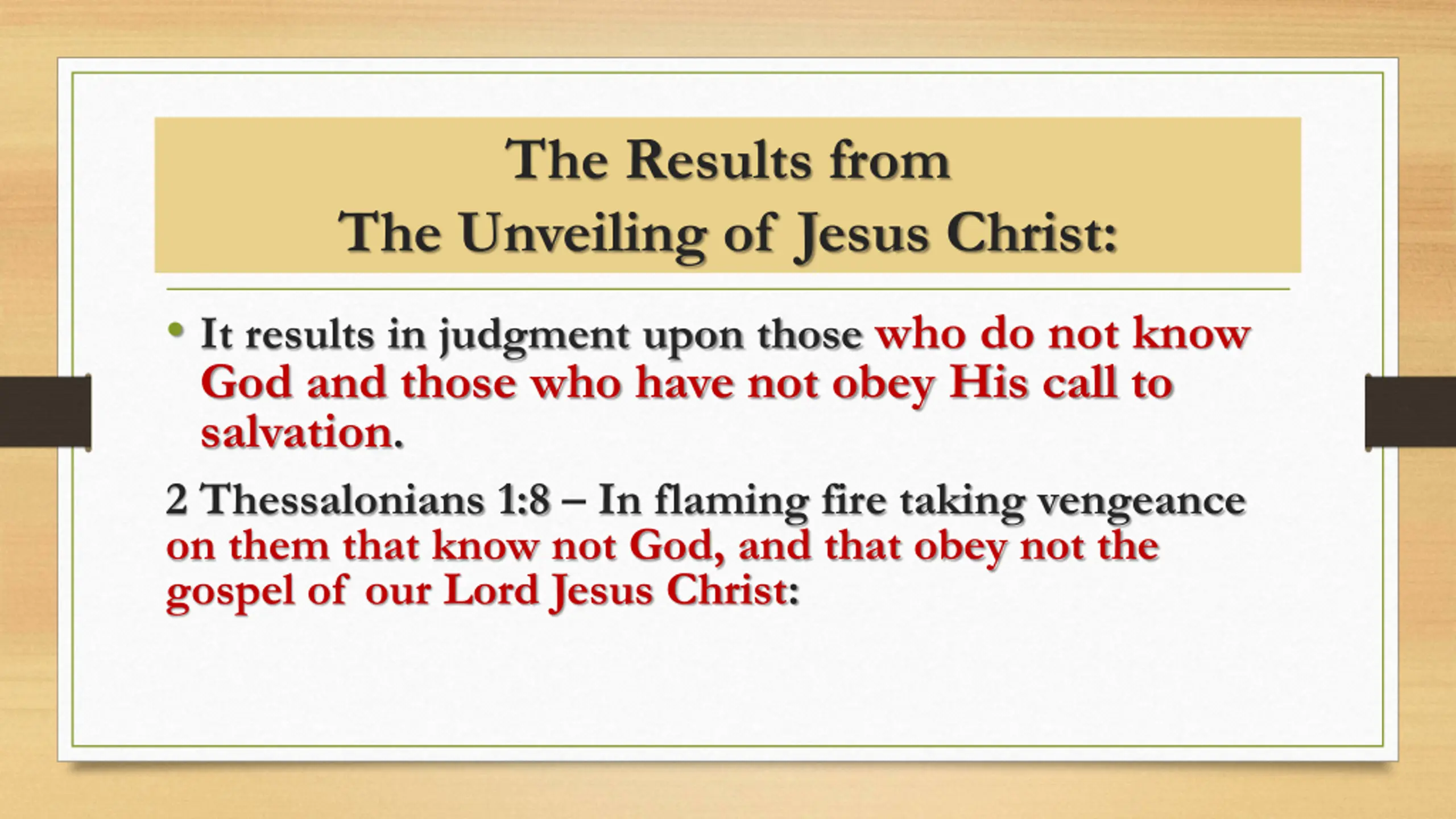 The Results from The Unveiling of Jesus Christ: It results in judgment upon those who do not know God and those who have not obey His call to salvation. 2 Thessalonians 1:8 In flaming fire taking vengeance on them that know not God, and that obey not the gospel of our Lord Jesus Christ: