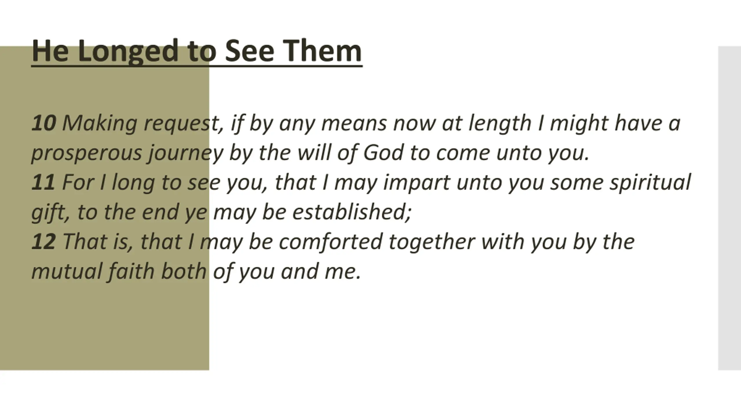 He Longed to See Them 10 Making request, if by any means now at length I might have a prosperous journey by the will of God to come unto you. 11 For I long to see you, that I may impart unto you some spiritual gift, to the end ye may be established; 12 That is, that I may be comforted together with you by the mutual faith both of you and me.