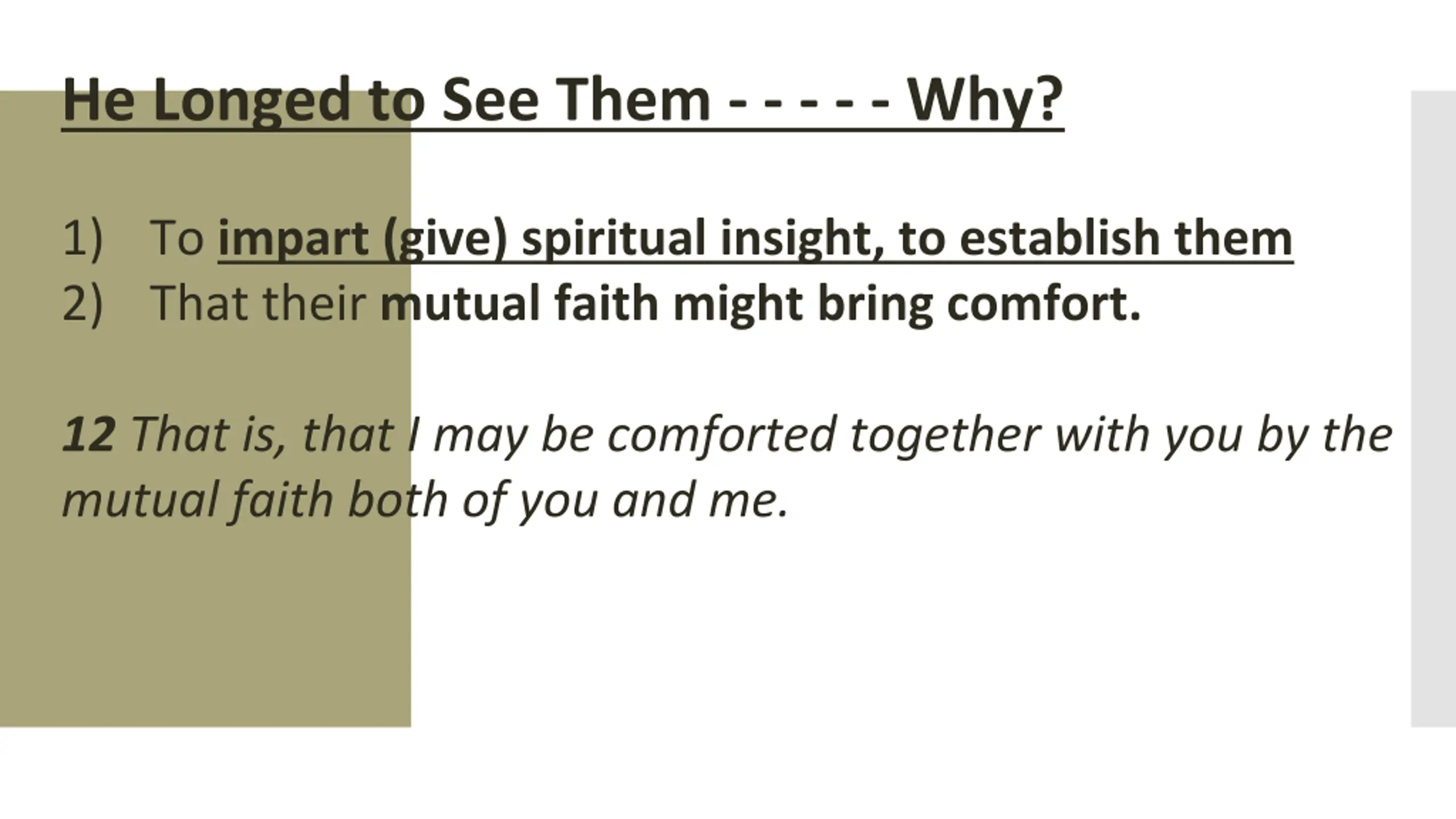 He Longed to See Them - - - - - Why? 1) To impart (give) spiritual insight, to establish them 2) That their mutual faith might bring comfort. 12 That is, that I may be comforted together with you by the mutual faith both of you and me.