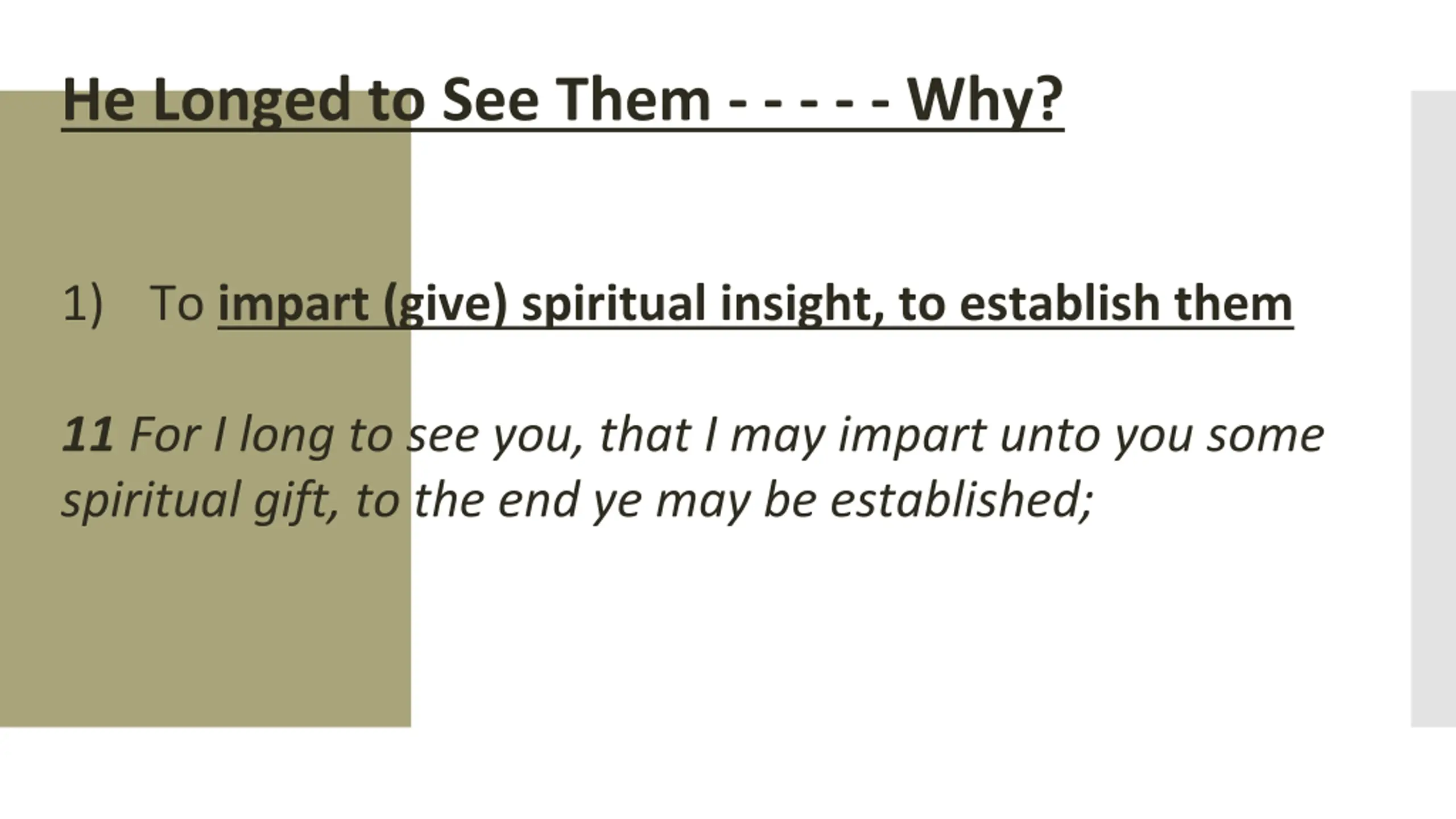 He Longed to See Them - - - - - Why? 1) To impart (give) spiritual insight, to establish them 11 For I long to see you, that I may impart unto you some spiritual gift, to the end ye may be established;