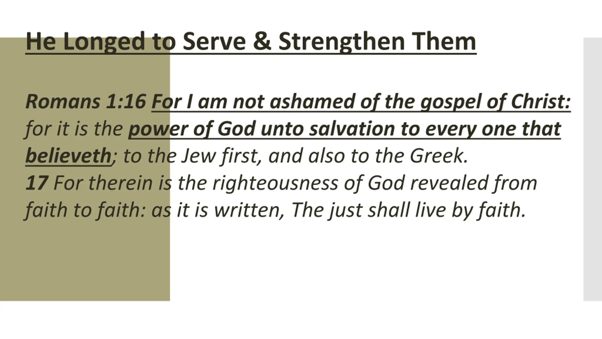 He Longed to Serve & Strengthen Them Romans 1:16 For I am not ashamed of the gospel of Christ: for it is the power of God unto salvation to every one that believeth; to the Jew first, and also to the Greek. 17 For therein is the righteousness of God revealed from faith to faith: as it is written, The just shall live by faith.