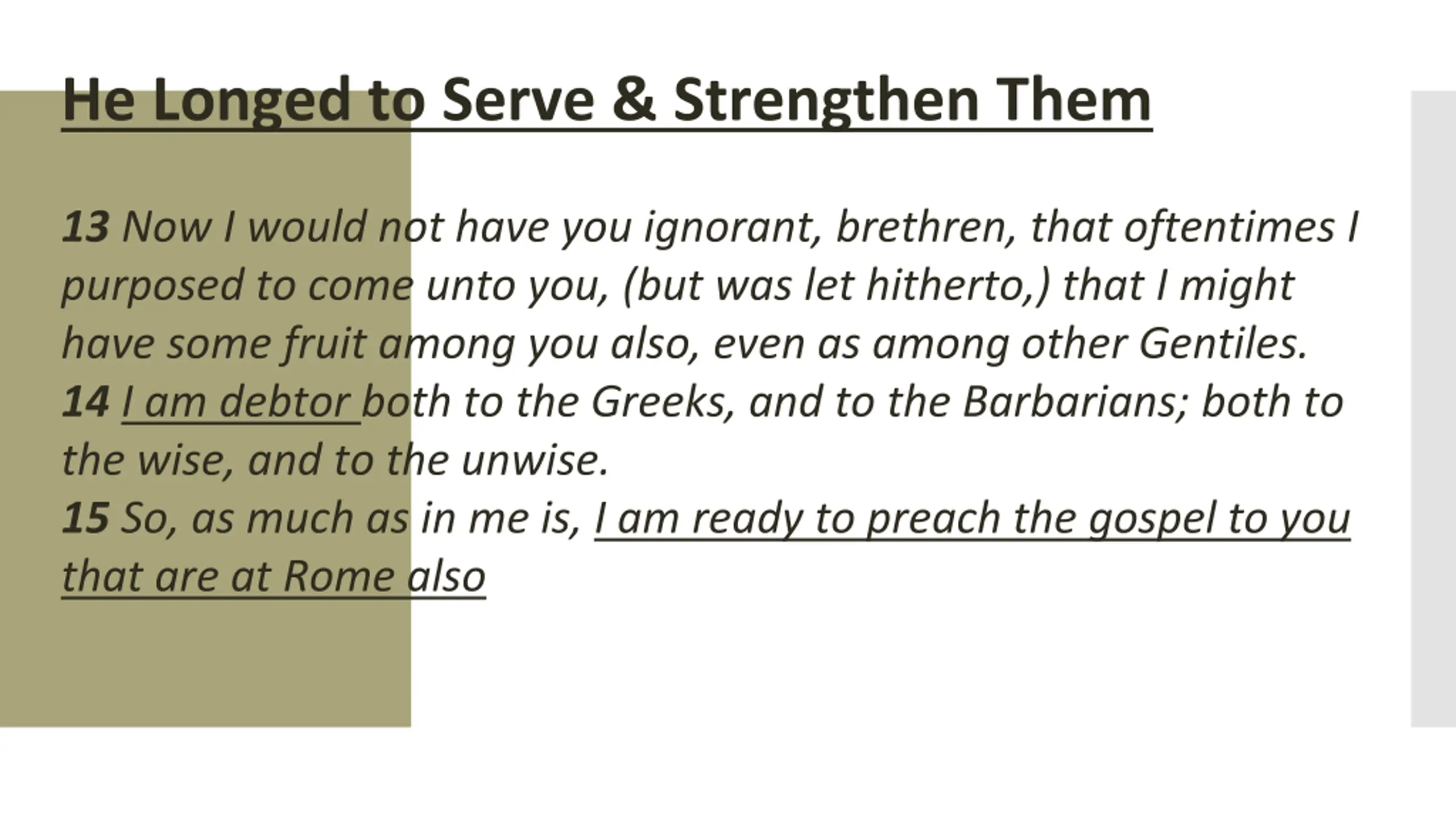 He Longed to Serve & Strengthen Them 13 Now I would not have you ignorant, brethren, that oftentimes I purposed to come unto you, (but was let hitherto,) that I might have some fruit among you also, even as among other Gentiles. 14 I am debtor both to the Greeks, and to the Barbarians; both to the wise, and to the unwise. 15 So, as much as in me is, I am ready to preach the gospel to you that are at Rome also