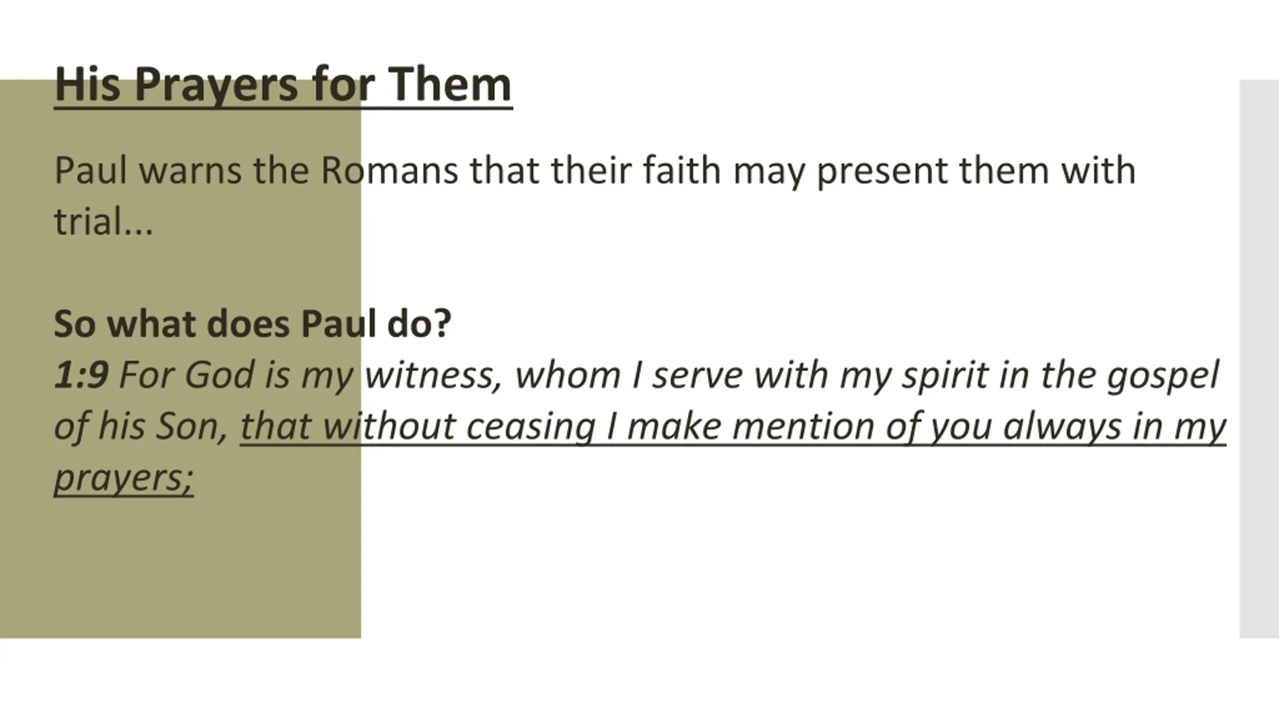 His Prayers for Them Paul warns the Romans that their faith may present them with trial... So what does Paul do? 1:9 For God is my witness, whom I serve with my spirit in the gospel of his Son, that without ceasing I make mention of you always in my prayers;