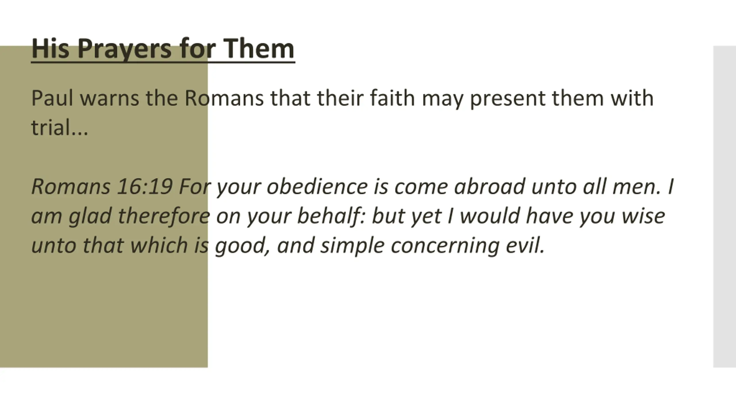 His Prayers for Them Paul warns the Romans that their faith may present them with trial... Romans 16:19 For your obedience is come abroad unto all men. I am glad therefore on your behalf: but yet I would have you wise unto that which is good, and simple concerning evil.