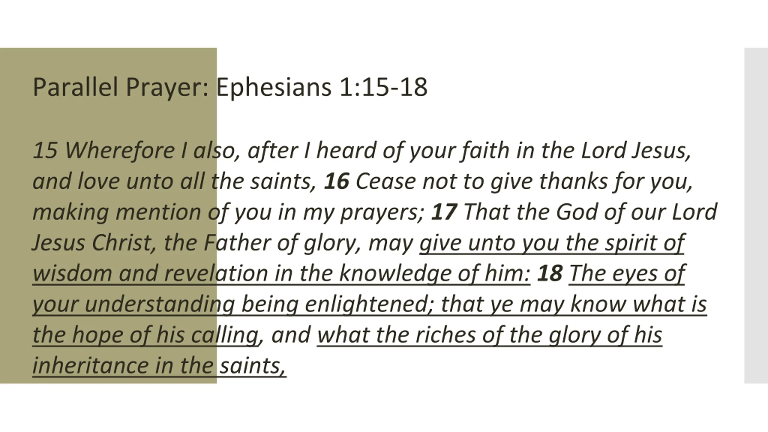 Parallel Prayer: Ephesians 1:15-18 15 Wherefore I also, after I heard of your faith in the Lord Jesus, and love unto all the saints, 16 Cease not to give thanks for you, making mention of you in my prayers; 17 That the God of our Lord Jesus Christ, the Father of glory, may give unto you the spirit of wisdom and revelation in the knowledge of him: 18 The eyes of your understanding being enlightened; that ye may know what is the hope of his calling, and what the riches of the glory of his inheritance in the saints,