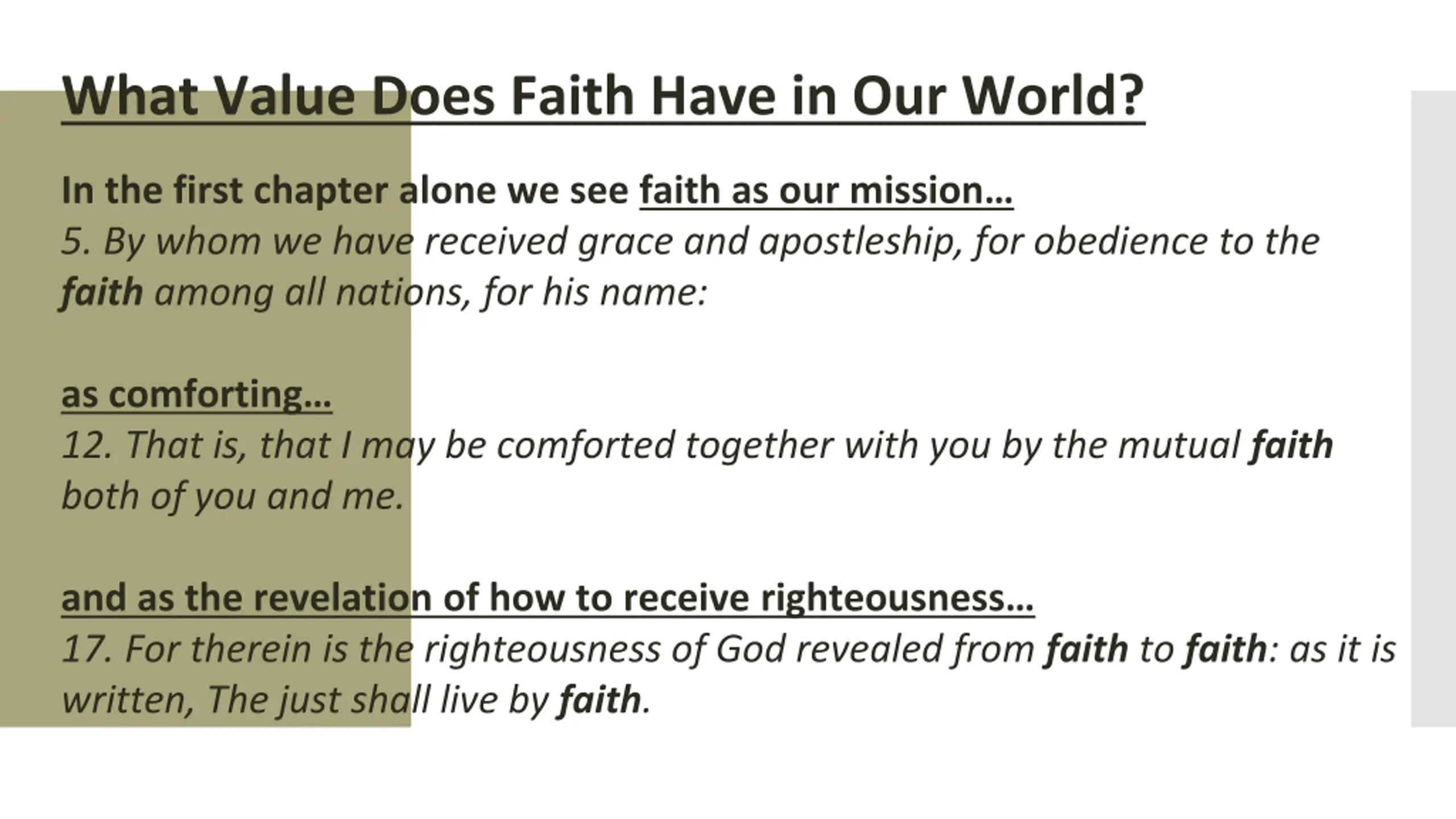 What Value Does Faith Have in Our World? In the first chapter alone we see faith as our mission 5. By whom we have received grace and apostleship, for obedience to the faith among all nations, for his name: as comforting 12. That is, that I may be comforted together with you by the mutual faith both of you and me. and as the revelation of how to receive righteousness 17. For therein is the righteousness of God revealed from faith to faith: as it is written, The just shall live by faith.