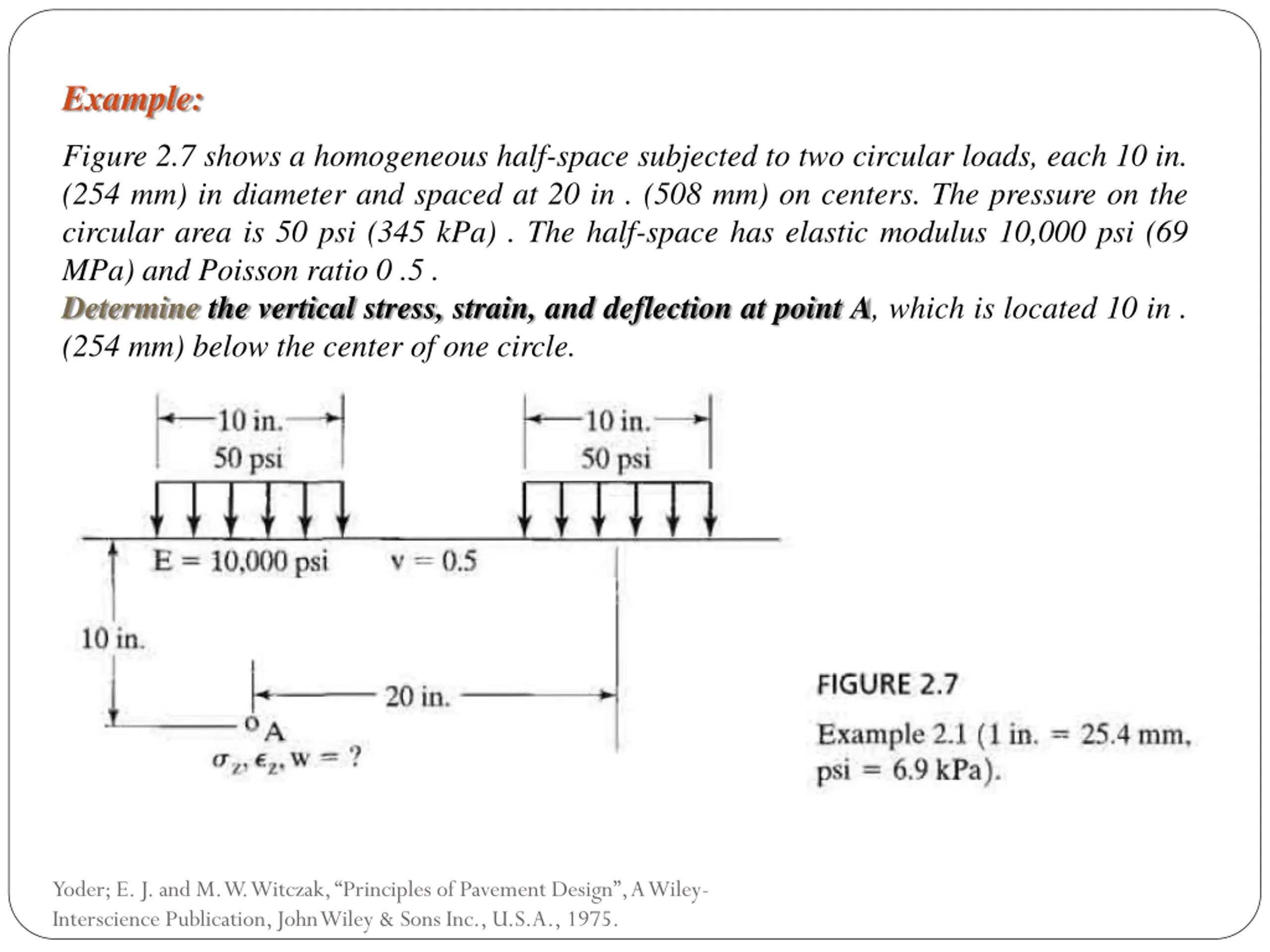 Example: Figure 2.7 shows a homogeneous half-space subjected to two circular loads, each 10 in. (254 mm) in diameter and spaced at 20 in . (508 mm) on centers. The pressure on the circular area is 50 psi (345 kPa) . The half-space has elastic modulus 10,000 psi (69 MPa) and Poisson ratio 0 .5 . Determinethe vertical stress, strain, and deflection at point A, which is located 10 in . (254 mm) below the center of one circle. Yoder; E. J. and M. W. Witczak, Principles of Pavement Design , A Wiley- Interscience Publication, John Wiley & Sons Inc., U.S.A., 1975.