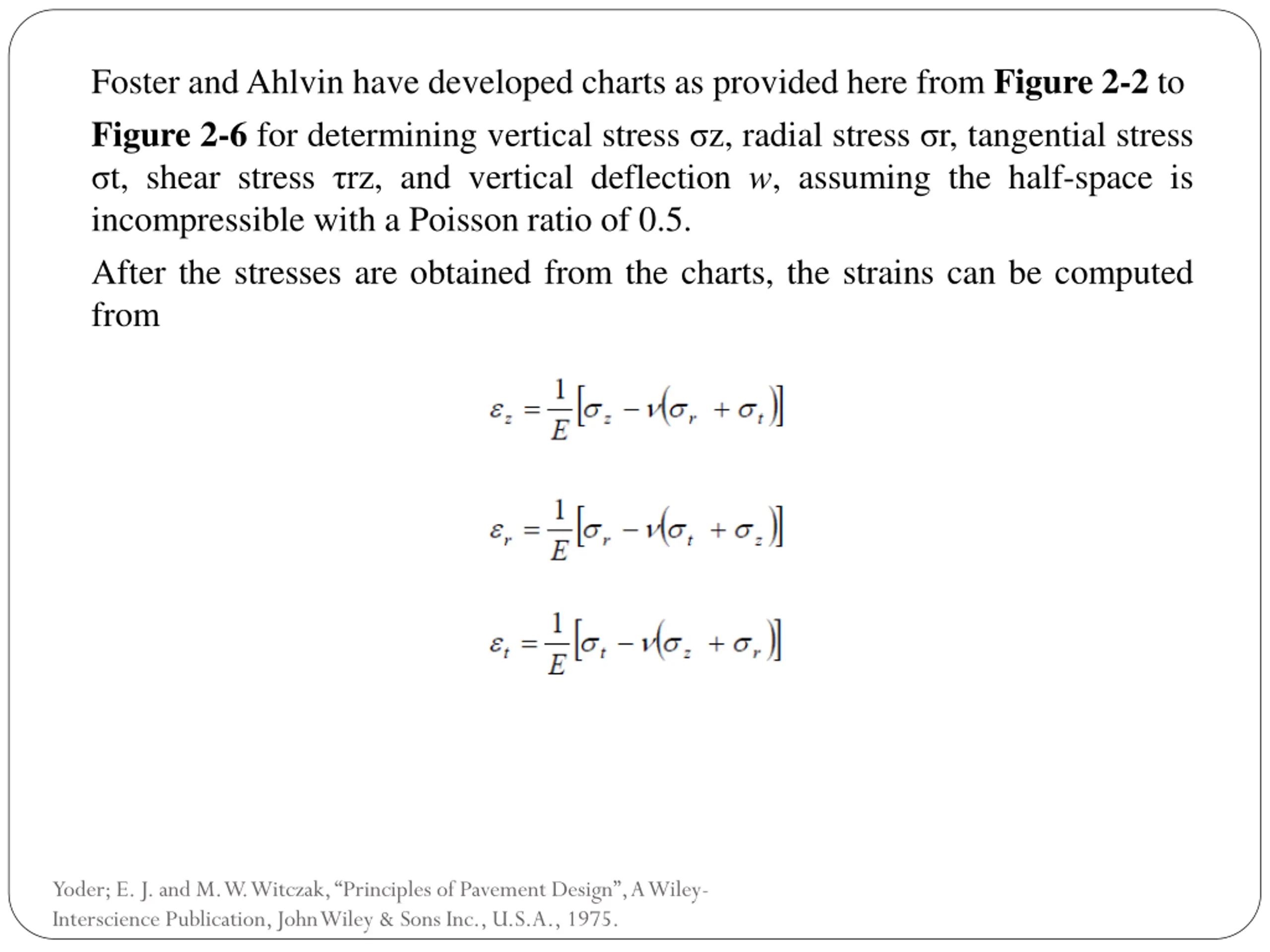 Foster and Ahlvin have developed charts as provided here from Figure 2-2 to Figure 2-6 for determining vertical stress z, radial stress r, tangential stress t, shear stress rz, and vertical deflection w, assuming the half-space is incompressible with a Poisson ratio of 0.5. After the stresses are obtained from the charts, the strains can be computed from Yoder; E. J. and M. W. Witczak, Principles of Pavement Design , A Wiley- Interscience Publication, John Wiley & Sons Inc., U.S.A., 1975.