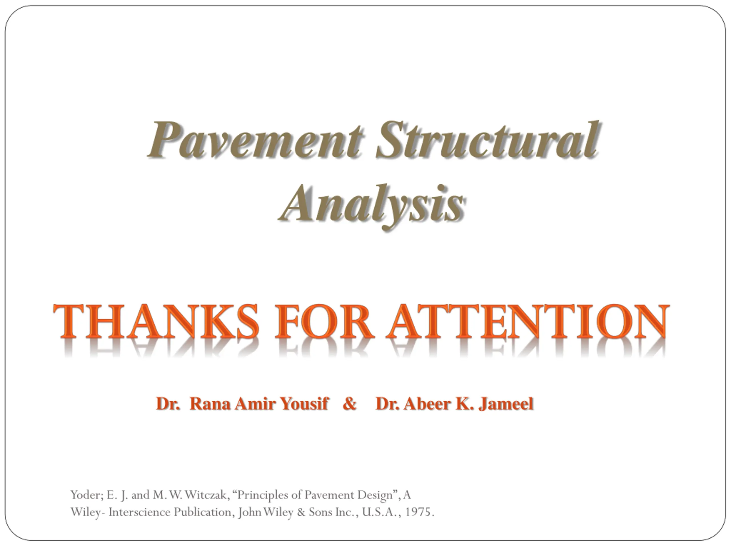 Pavement Structural Analysis Dr. Rana Amir Yousif & Dr. Abeer K. Jameel Yoder; E. J. and M. W. Witczak, Principles of Pavement Design , A Wiley- Interscience Publication, John Wiley & Sons Inc., U.S.A., 1975.