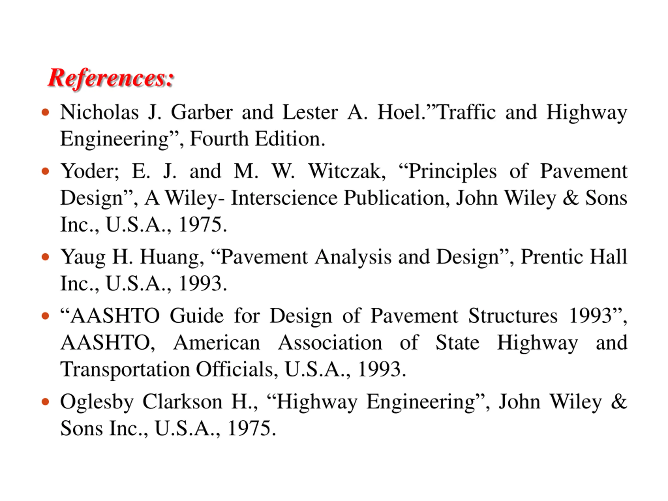 References: Nicholas J. Garber and Lester A. Hoel. Traffic and Highway Engineering , Fourth Edition. Yoder; E. J. and M. W. Witczak, Principles of Pavement Design , AWiley- Interscience Publication, John Wiley & Sons Inc., U.S.A., 1975. Yaug H. Huang, Pavement Analysis and Design , Prentic Hall Inc., U.S.A., 1993. AASHTO Guide for Design of Pavement Structures 1993 , AASHTO, American Association of State Highway and Transportation Officials, U.S.A., 1993. Oglesby Clarkson H., Highway Engineering , John Wiley & Sons Inc., U.S.A., 1975.