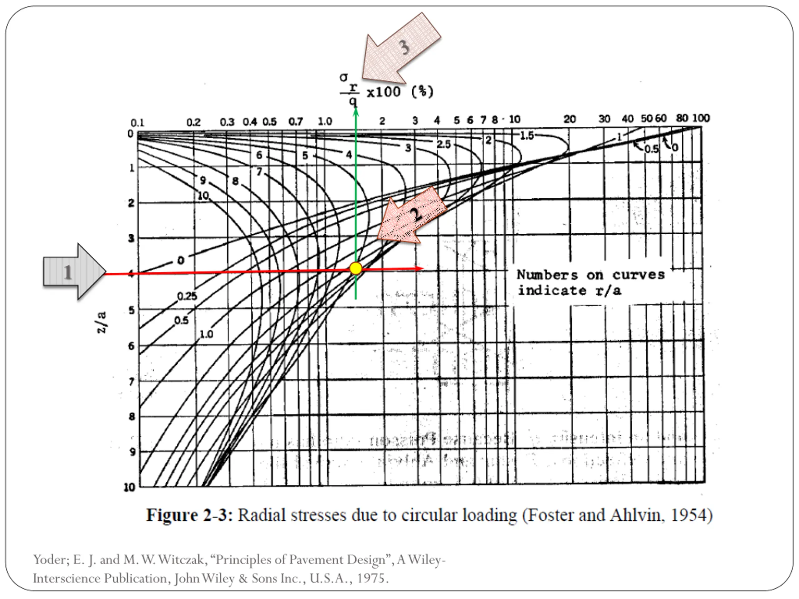 Solution: Find:- From Figures 2.3 the stresses at point A due to the right load right load z/a = 10/5 =2 r/a= 20/5 = 4 ( r / q)*100 =2.6 r = 0.026* 50 =1.3 psi Yoder; E. J. and M. W. Witczak, Principles of Pavement Design , A Wiley- Interscience Publication, John Wiley & Sons Inc., U.S.A., 1975.