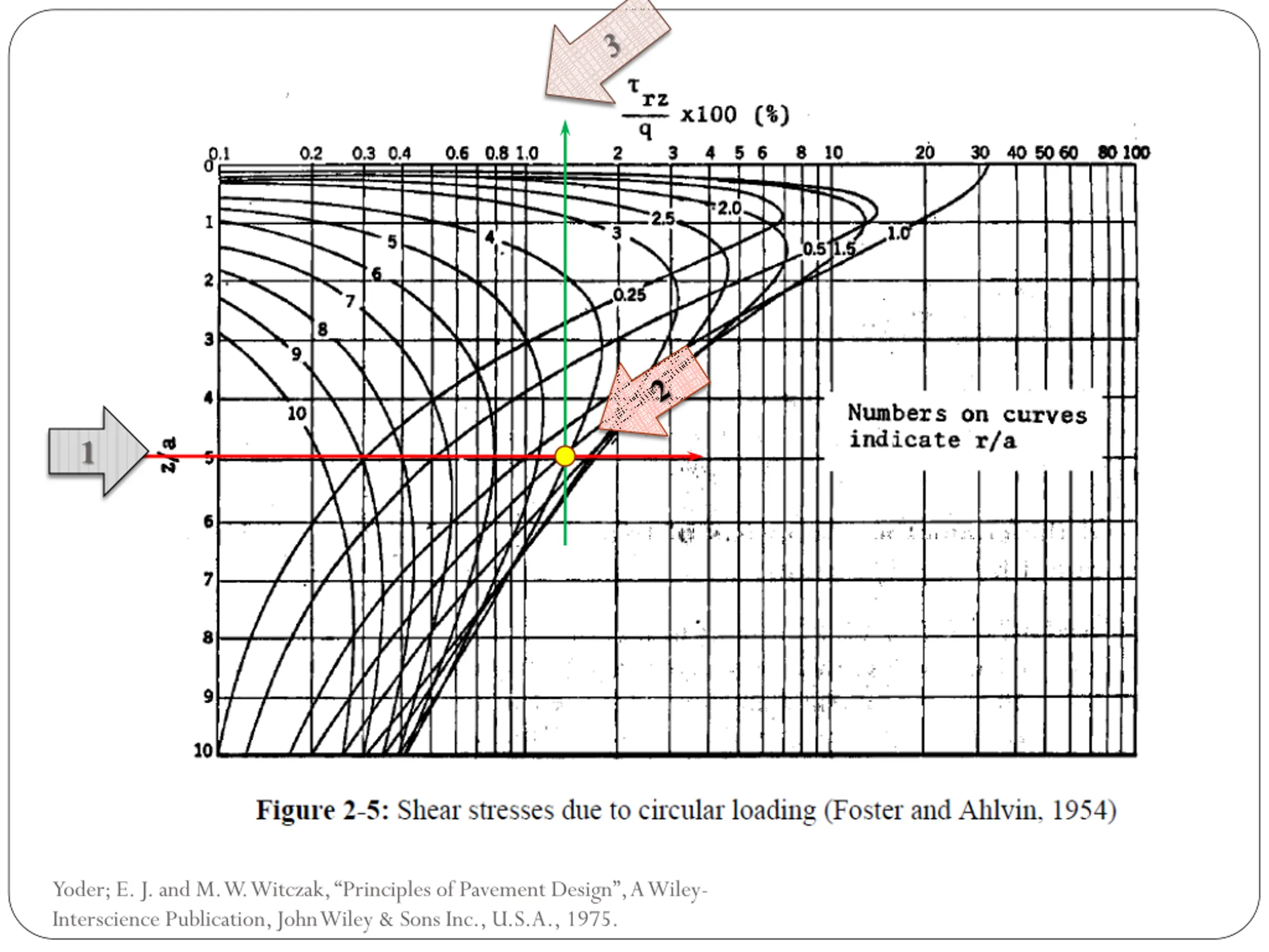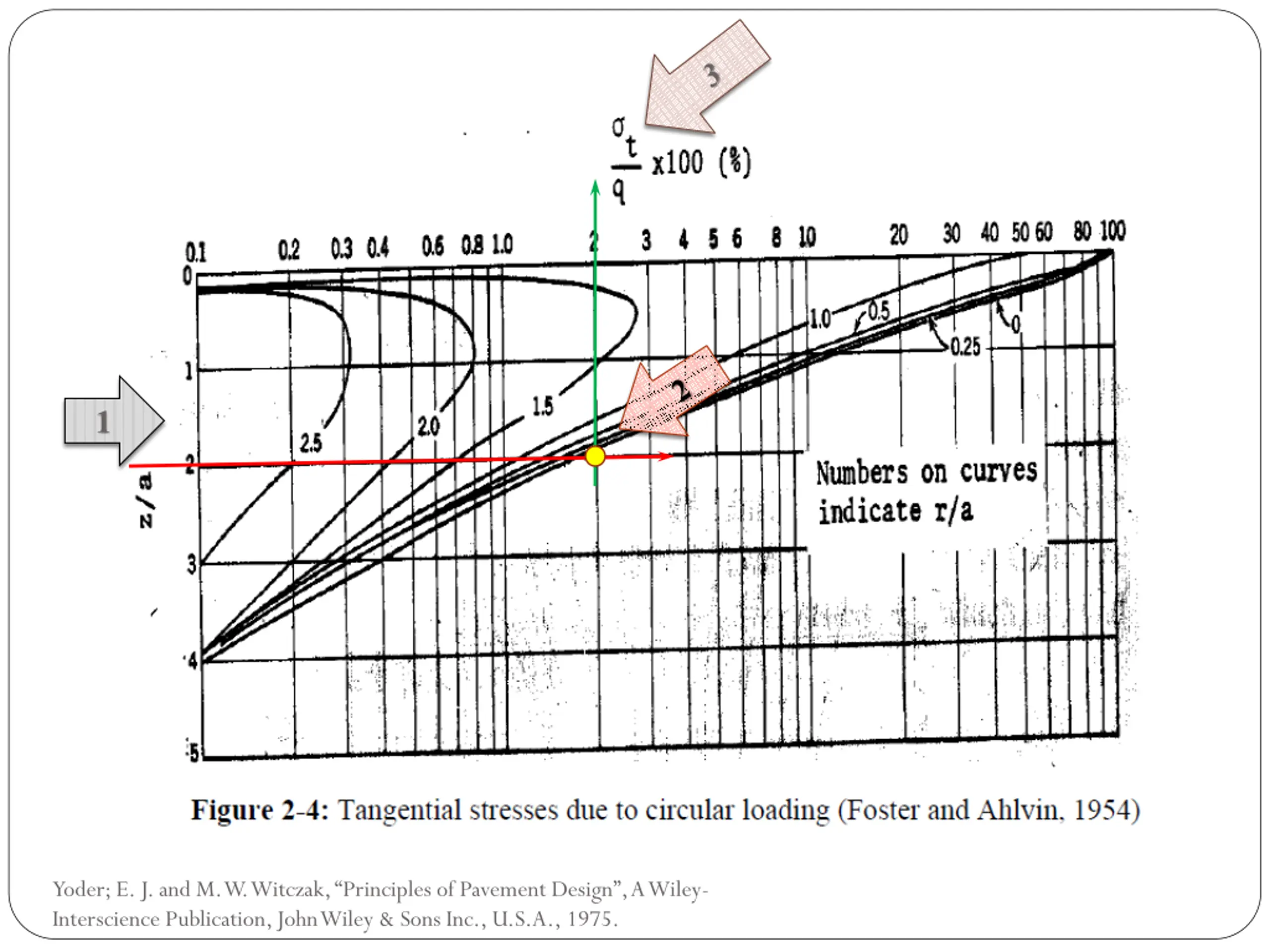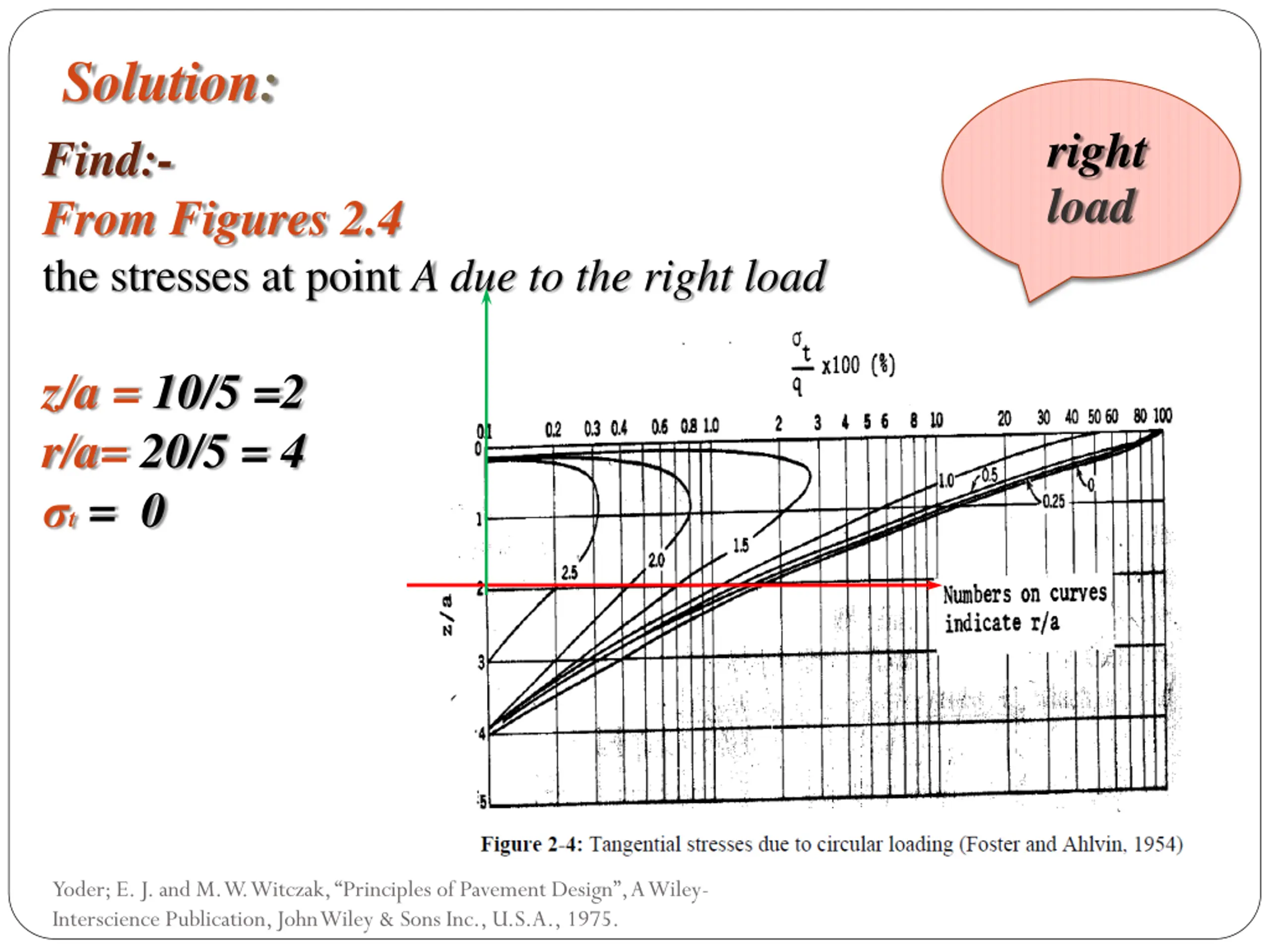 Solution: Given :- q = 50 psi z = 10.0 in a value = D/2 a = 5.0 in Find:- From Figures 2.2 the stresses at point A due to the right load right load z/a = 10/5 =2 r/a= 20/5 = 4 ( z / q)*100 =0.76 z = 0.0076* 50 =0.38 psi Yoder; E. J. and M. W. Witczak, Principles of Pavement Design , A Wiley- Interscience Publication, John Wiley & Sons Inc., U.S.A., 1975.
