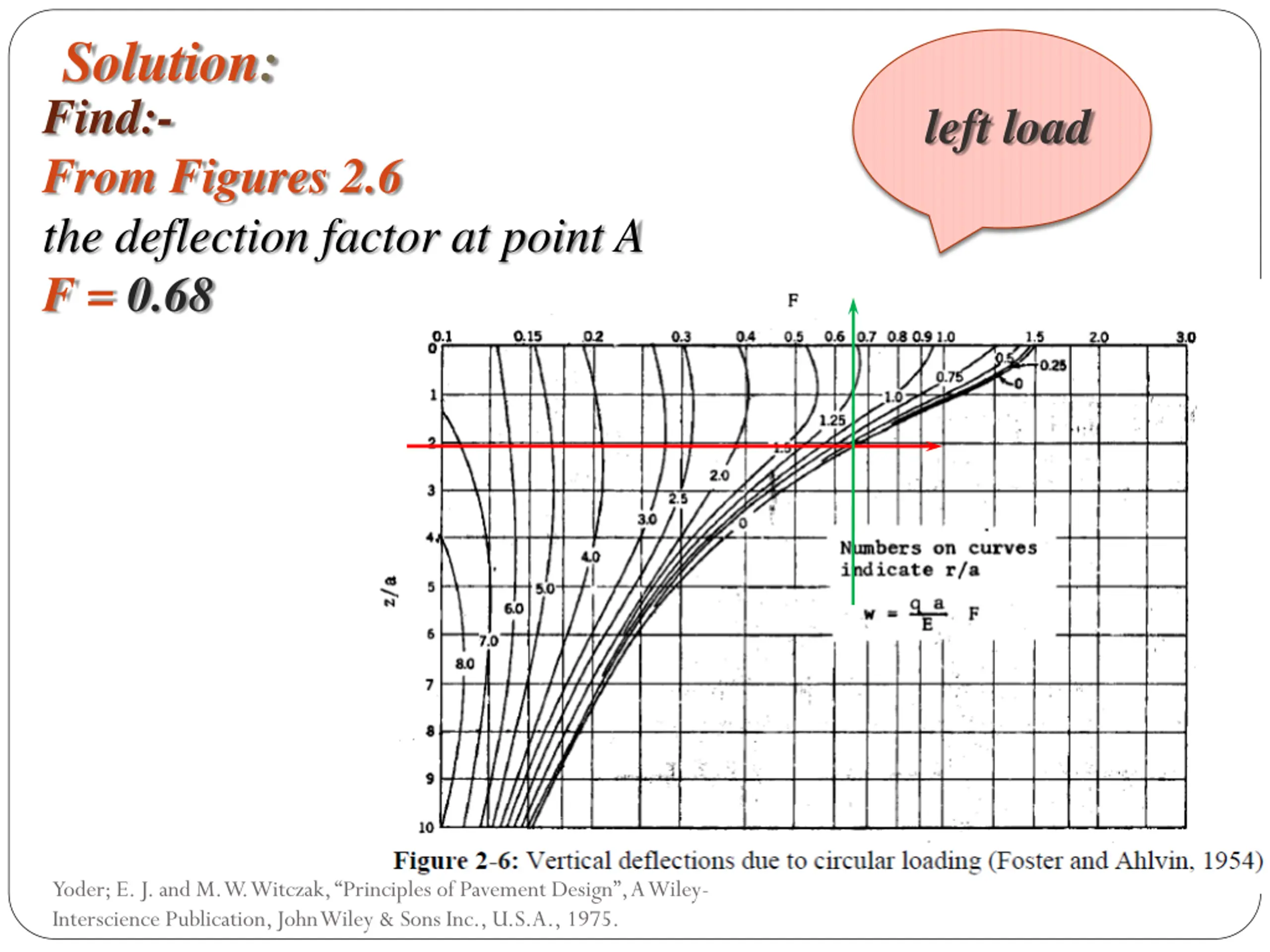 Solution: Find:- From Figures 2.6 the deflection factor at point A F = 0.68 left load Yoder; E. J. and M. W. Witczak, Principles of Pavement Design , A Wiley- Interscience Publication, John Wiley & Sons Inc., U.S.A., 1975.