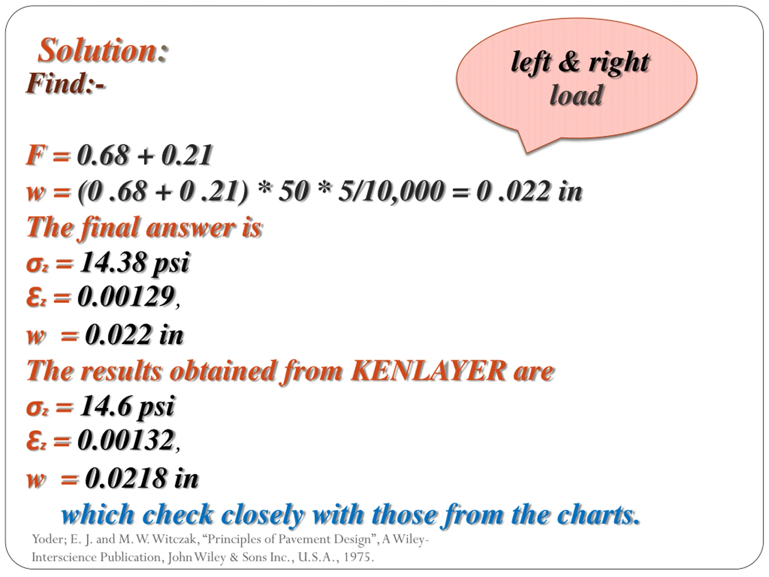 Solution: Find:- left & right load F = 0.68 + 0.21 w = (0 .68 + 0 .21) * 50 * 5/10,000 = 0 .022 in The final answer is z = 14.38 psi z= 0.00129, w = 0.022 in The results obtained from KENLAYER are z = 14.6 psi z= 0.00132, w = 0.0218 in which check closely with those from the charts. Yoder; E. J. and M. W. Witczak, Principles of Pavement Design , A Wiley- Interscience Publication, John Wiley & Sons Inc., U.S.A., 1975.