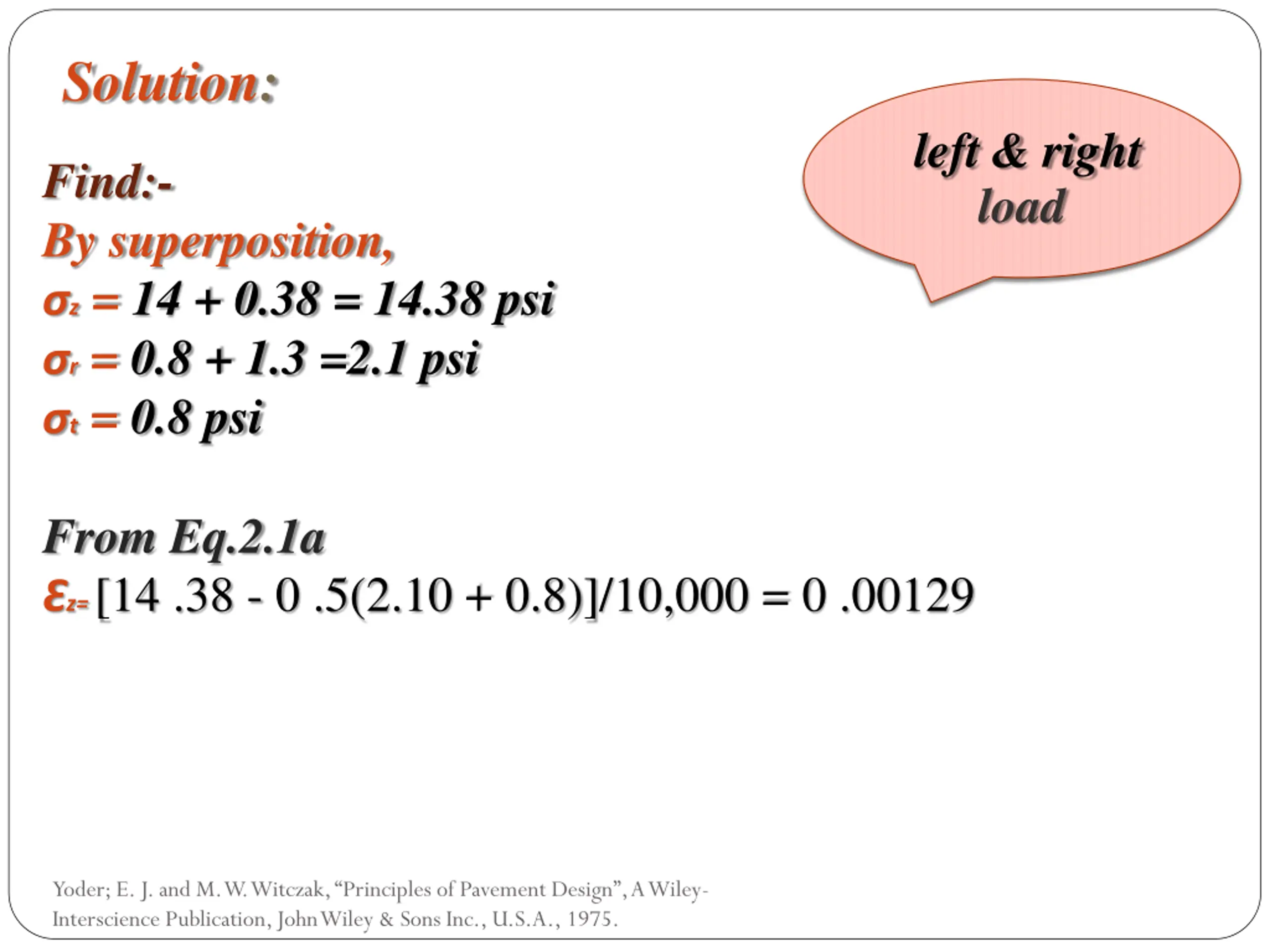Solution: left & right load Find:- By superposition, z = 14 + 0.38 = 14.38 psi r = 0.8 + 1.3 =2.1 psi t = 0.8 psi From Eq.2.1a z= [14 .38 - 0 .5(2.10 + 0.8)]/10,000 = 0 .00129 Yoder; E. J. and M. W. Witczak, Principles of Pavement Design , A Wiley- Interscience Publication, John Wiley & Sons Inc., U.S.A., 1975.