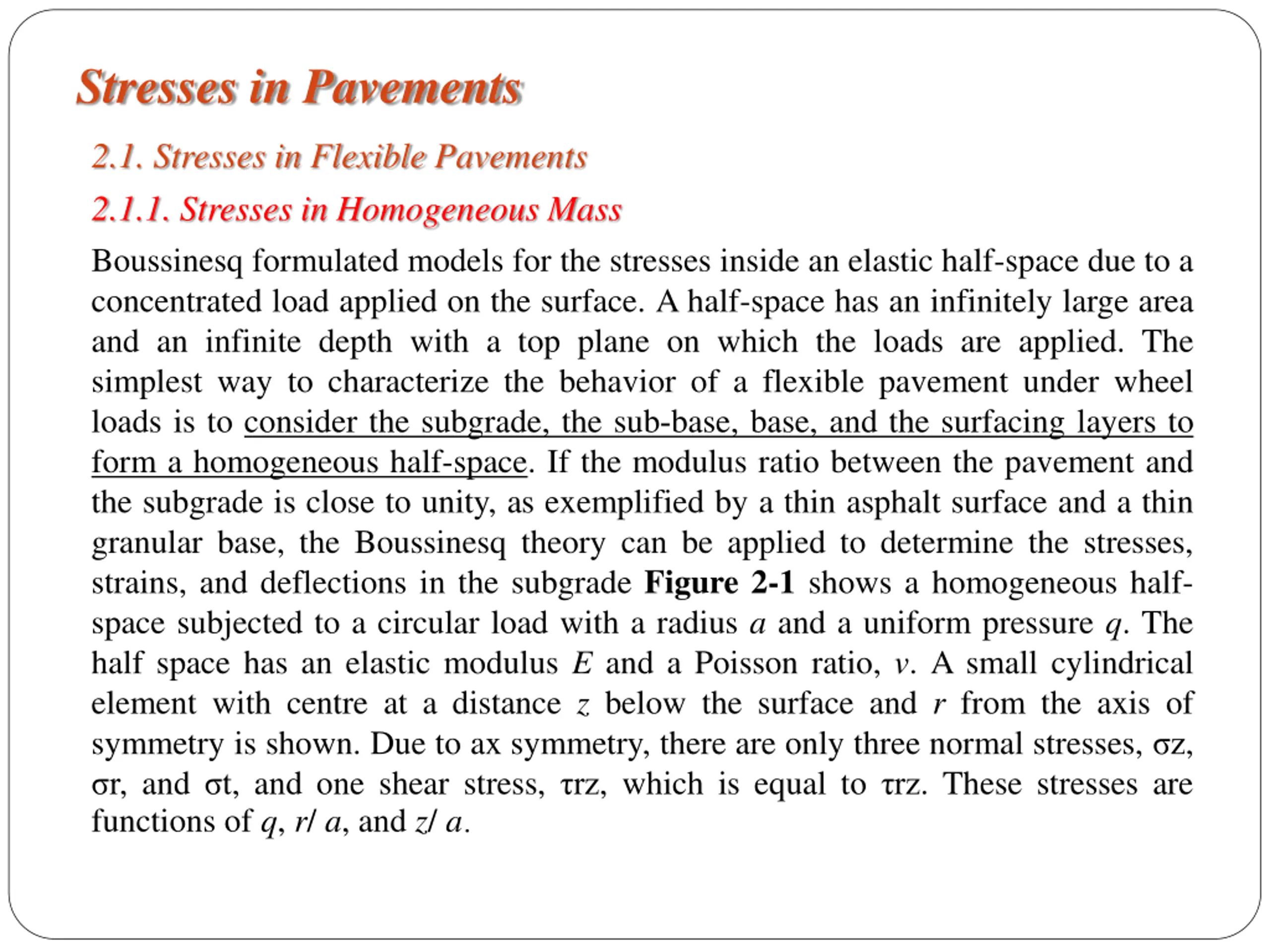 Stresses in Pavements 2.1. Stresses in Flexible Pavements 2.1.1. Stresses in Homogeneous Mass Boussinesq formulated models for the stresses inside an elastic half-space due to a concentrated load applied on the surface. A half-space has an infinitely large area and an infinite depth with a top plane on which the loads are applied. The simplest way to characterize the behavior of a flexible pavement under wheel loads is to consider the subgrade, the sub-base, base, and the surfacing layers to form a homogeneous half-space. If the modulus ratio between the pavement and the subgrade is close to unity, as exemplified by a thin asphalt surface and a thin granular base, the Boussinesq theory can be applied to determine the stresses, strains, and deflections in the subgrade Figure 2-1 shows a homogeneous half- space subjected to a circular load with a radius a and a uniform pressure q. The half space has an elastic modulus E and a Poisson ratio, v. A small cylindrical element with centre at a distance z below the surface and r from the axis of symmetry is shown. Due to ax symmetry, there are only three normal stresses, z, r, and t, and one shear stress, rz, which is equal to rz. These stresses are functions of q, r/ a, and z/ a.