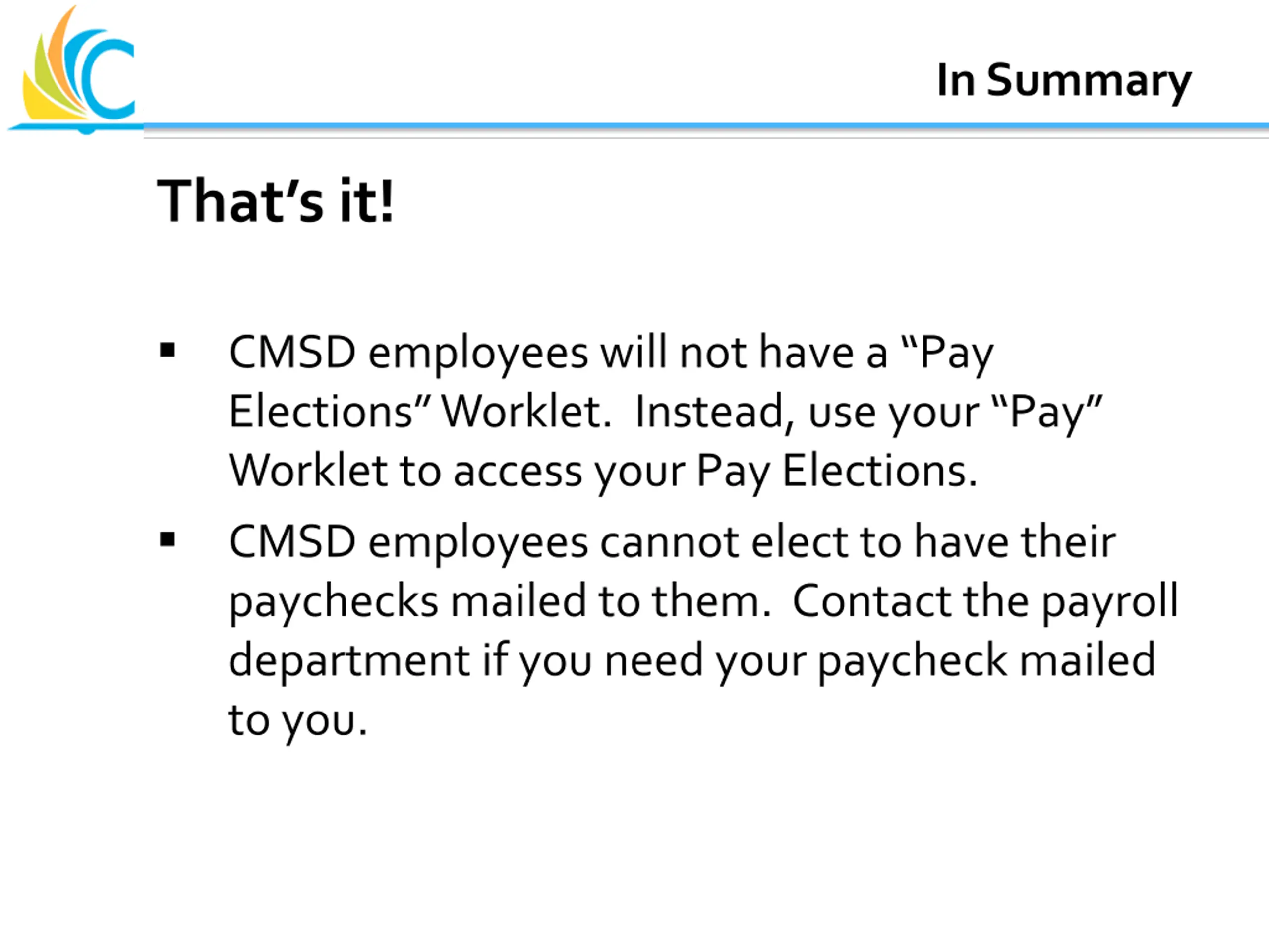 In Summary That s it! Great Teachers Great Leaders Great Schools CMSD employees will not have a Pay Elections Worklet. Instead, use your Pay Worklet to access your Pay Elections. CMSD employees cannot elect to have their paychecks mailed to them. Contact the payroll department if you need your paycheck mailed to you.