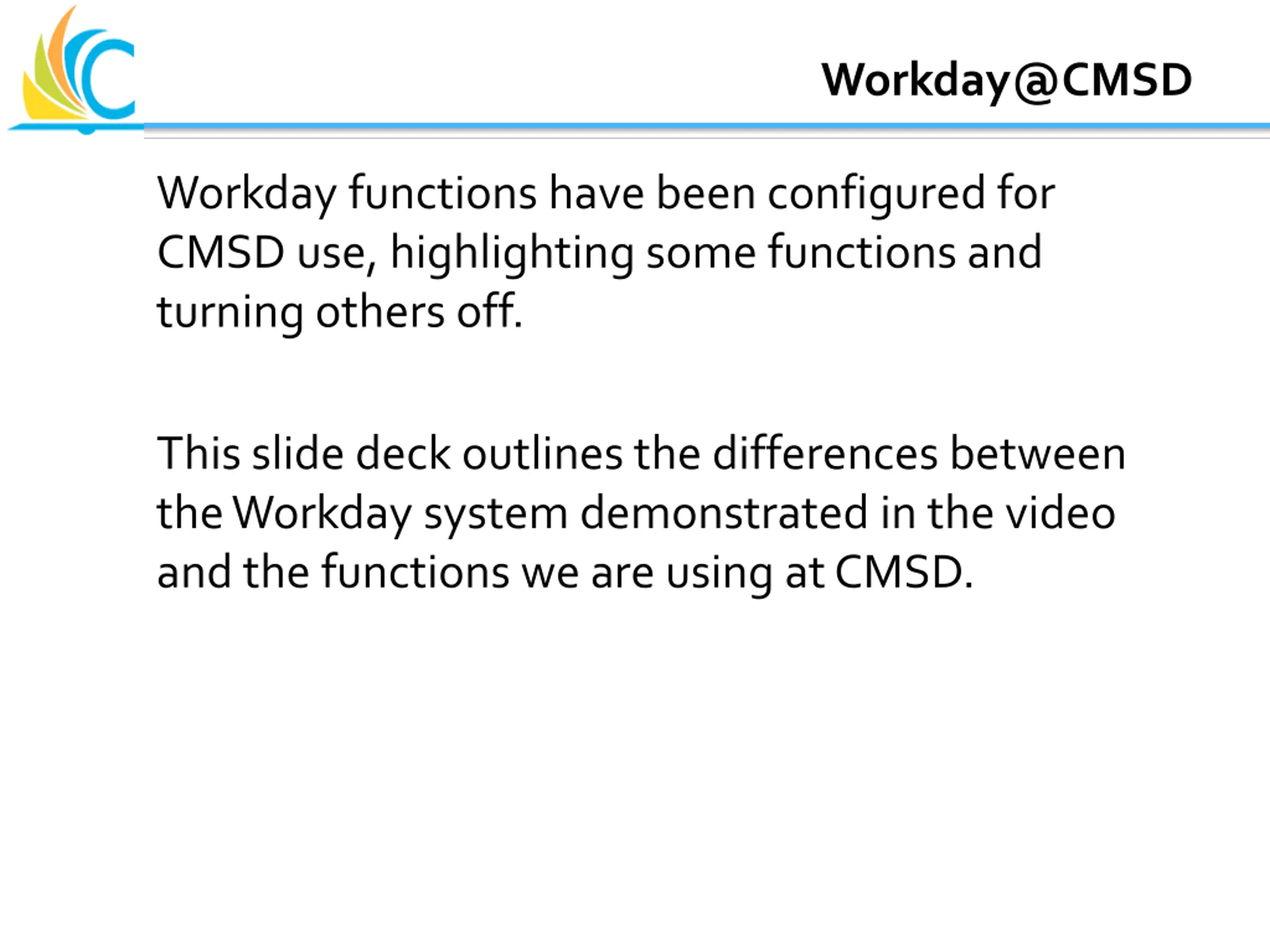 Workday@CMSD Workday functions have been configured for CMSD use, highlighting some functions and turning others off. Great Teachers Great Leaders Great Schools This slide deck outlines the differences between the Workday system demonstrated in the video and the functions we are using at CMSD.