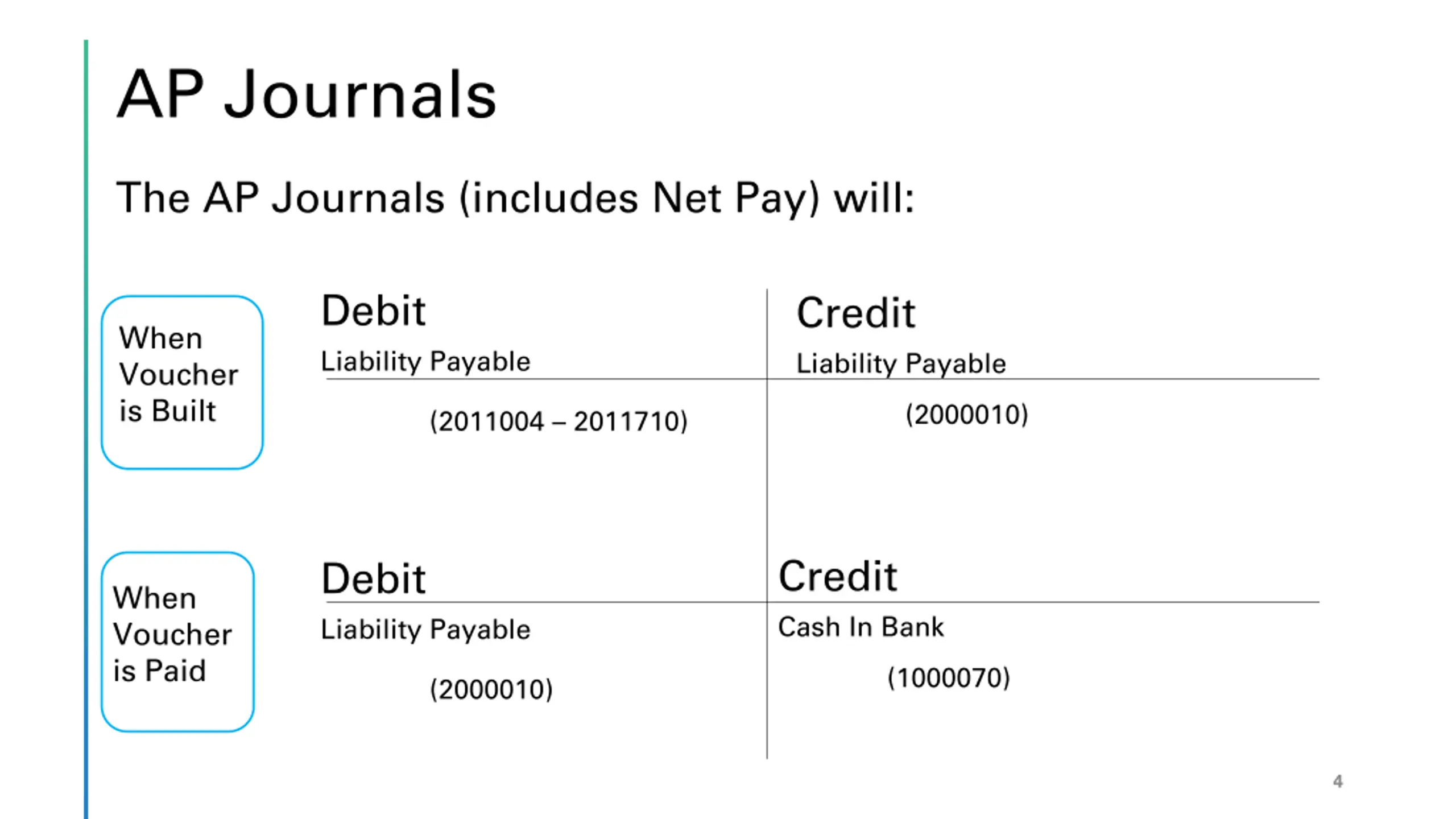 AP Journals The AP Journals (includes Net Pay) will: Debit Liability Payable Credit Liability Payable When Voucher is Built (2000010) (2011004 2011710) Credit Cash In Bank Debit Liability Payable When Voucher is Paid (1000070) (2000010) 4