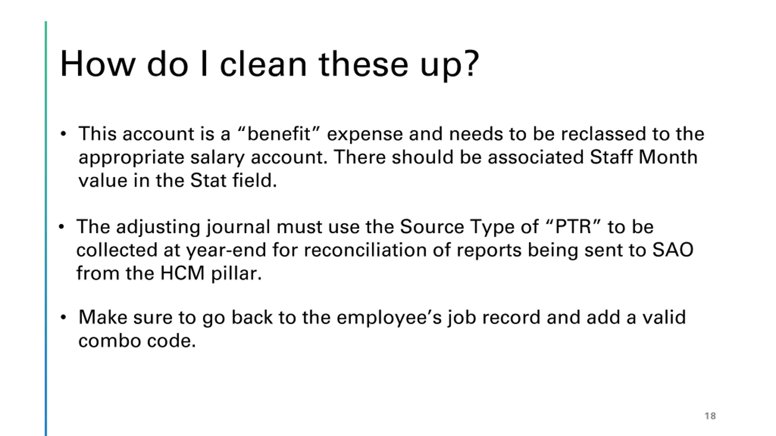 How do I clean these up? This account is a benefit expense and needs to be reclassed to the appropriate salary account. There should be associated Staff Month value in the Stat field. The adjusting journal must use the Source Type of PTR to be collected at year-end for reconciliation of reports being sent to SAO from the HCM pillar. Make sure to go back to the employee s job record and add a valid combo code. 18
