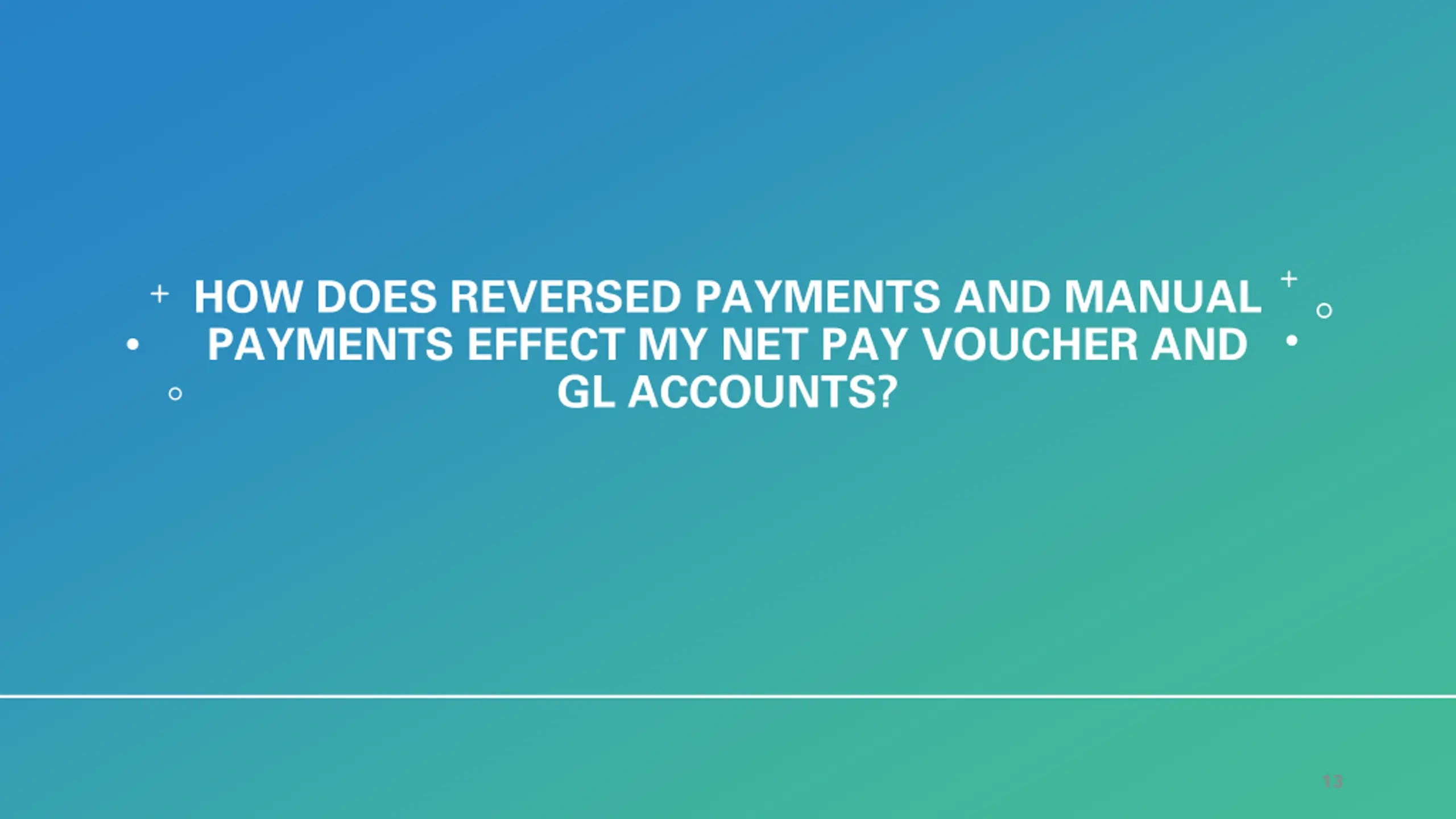 HOW DOES REVERSED PAYMENTS AND MANUAL PAYMENTS EFFECT MY NET PAY VOUCHER AND GL ACCOUNTS? 13