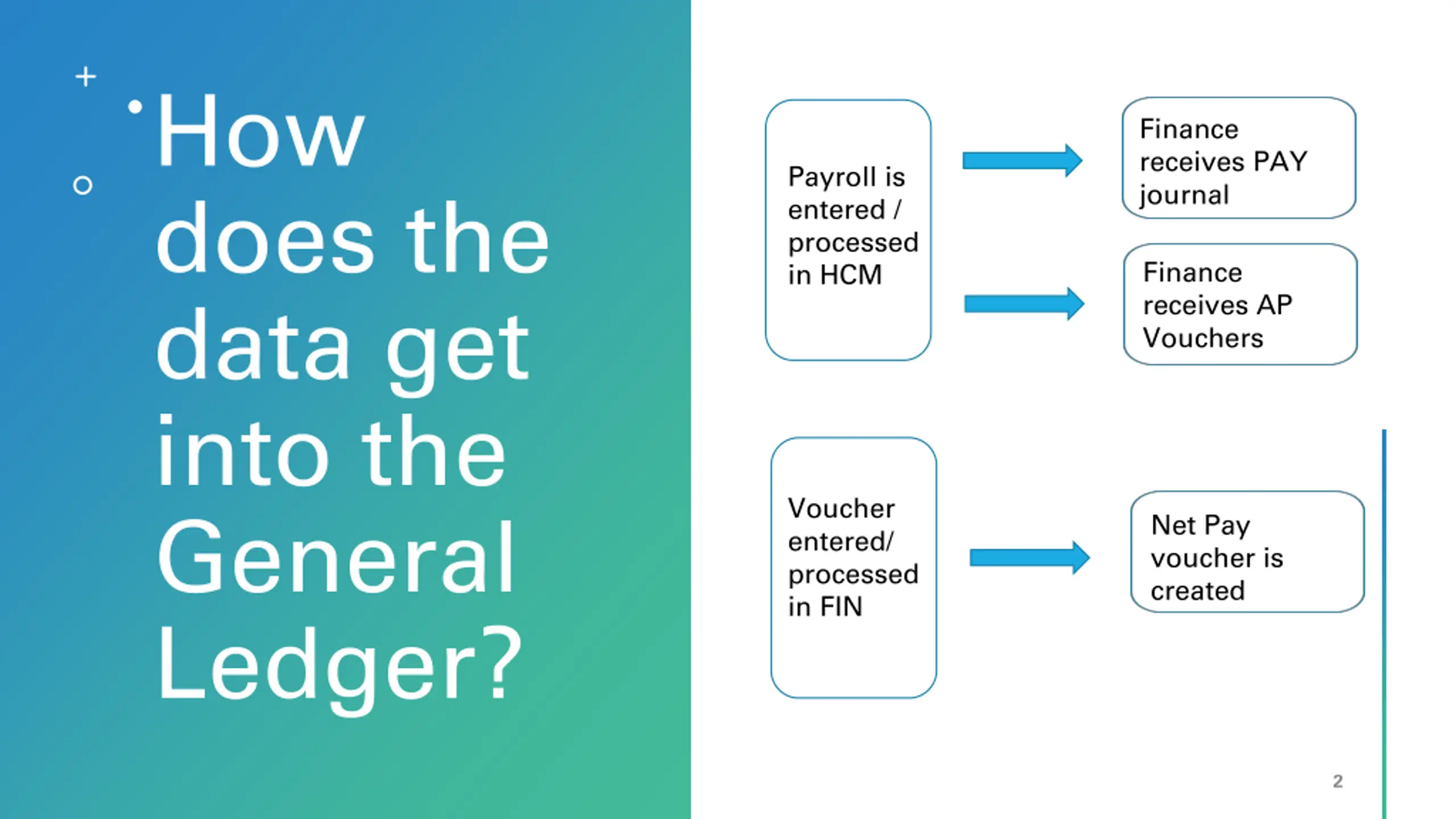How does the data get into the General Ledger? Finance receives PAY journal Payroll is entered / processed in HCM Finance receives AP Vouchers Voucher entered/ processed in FIN Net Pay voucher is created 2