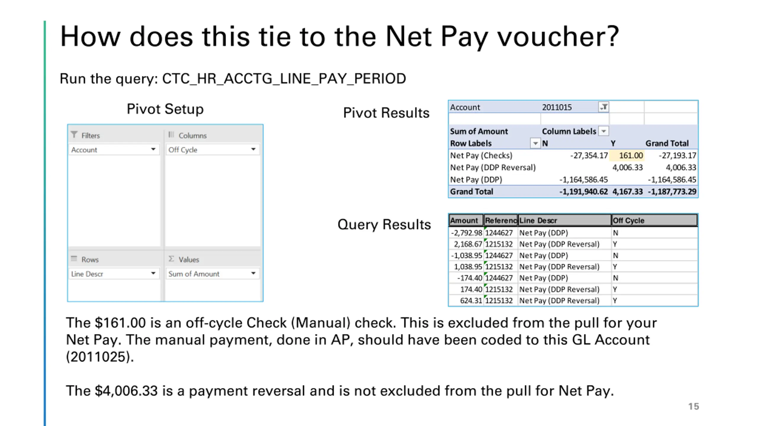 How does this tie to the Net Pay voucher? Run the query: CTC_HR_ACCTG_LINE_PAY_PERIOD Pivot Setup Account 2011015 Pivot Results Sum of Amount Row Labels Net Pay (Checks) Net Pay (DDP Reversal) Net Pay (DDP) Grand Total Column Labels N Y Grand Total -27,193.17 4,006.33 -1,164,586.45 -27,354.17 161.00 4,006.33 -1,164,586.45 -1,191,940.62 4,167.33 -1,187,773.29 Query Results Amount Reference Line Descr Off Cycle -2,792.98 1244627 Net Pay (DDP) 2,168.67 1215132 Net Pay (DDP Reversal) -1,038.95 1244627 Net Pay (DDP) 1,038.95 1215132 Net Pay (DDP Reversal) -174.40 1244627 Net Pay (DDP) 174.40 1215132 Net Pay (DDP Reversal) 624.31 1215132 Net Pay (DDP Reversal) N Y N Y N Y Y The $161.00 is an off-cycle Check (Manual) check. This is excluded from the pull for your Net Pay. The manual payment, done in AP, should have been coded to this GL Account (2011025). The $4,006.33 is a payment reversal and is not excluded from the pull for Net Pay. 15