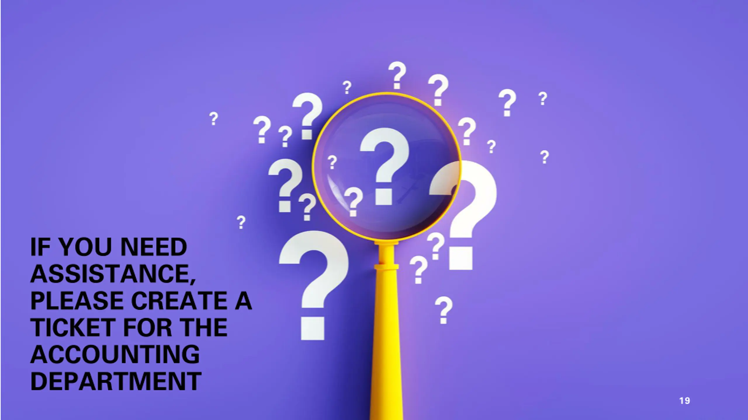 IF YOU NEED ASSISTANCE, PLEASE CREATE A TICKET FOR THE ACCOUNTING DEPARTMENT 19