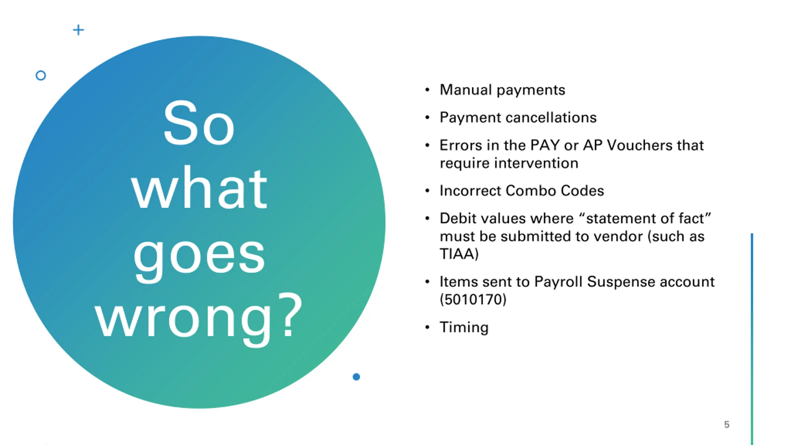 Manual payments So what goes wrong? Payment cancellations Errors in the PAY or AP Vouchers that require intervention Incorrect Combo Codes Debit values where statement of fact must be submitted to vendor (such as TIAA) Items sent to Payroll Suspense account (5010170) Timing 5