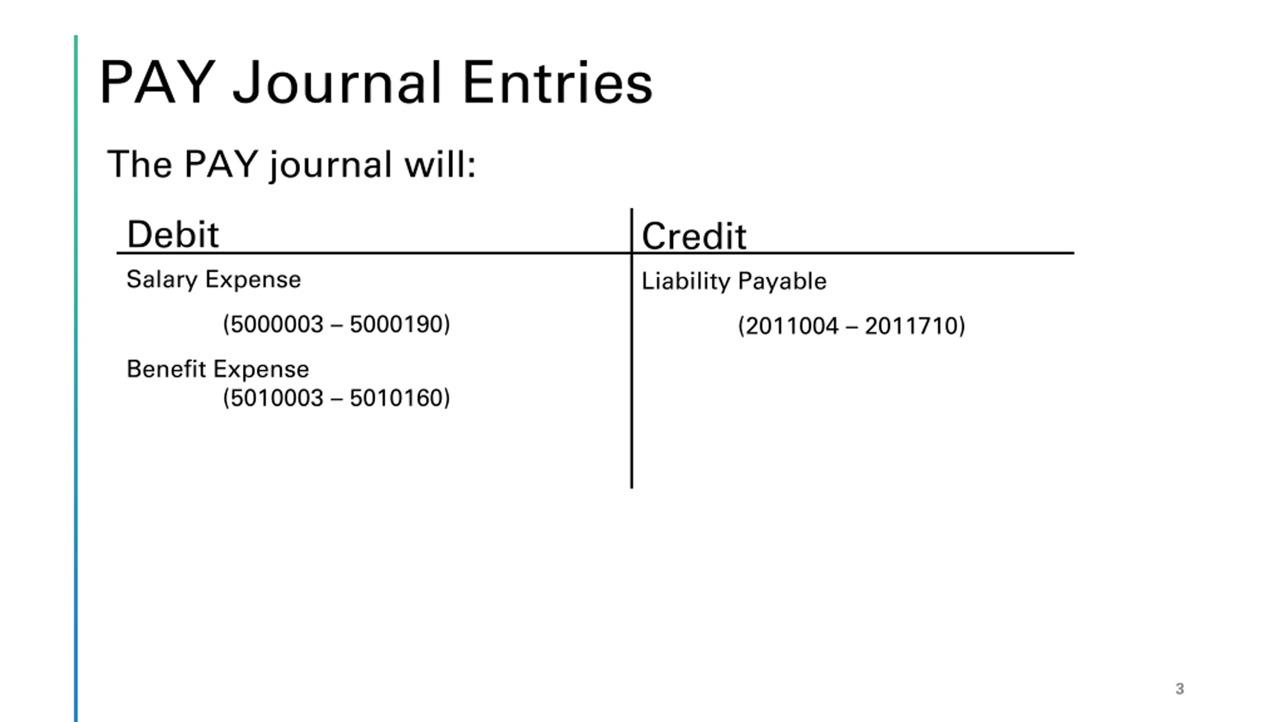 PAY Journal Entries The PAY journal will: Debit Salary Expense Credit Liability Payable (5000003 5000190) (2011004 2011710) Benefit Expense (5010003 5010160) 3