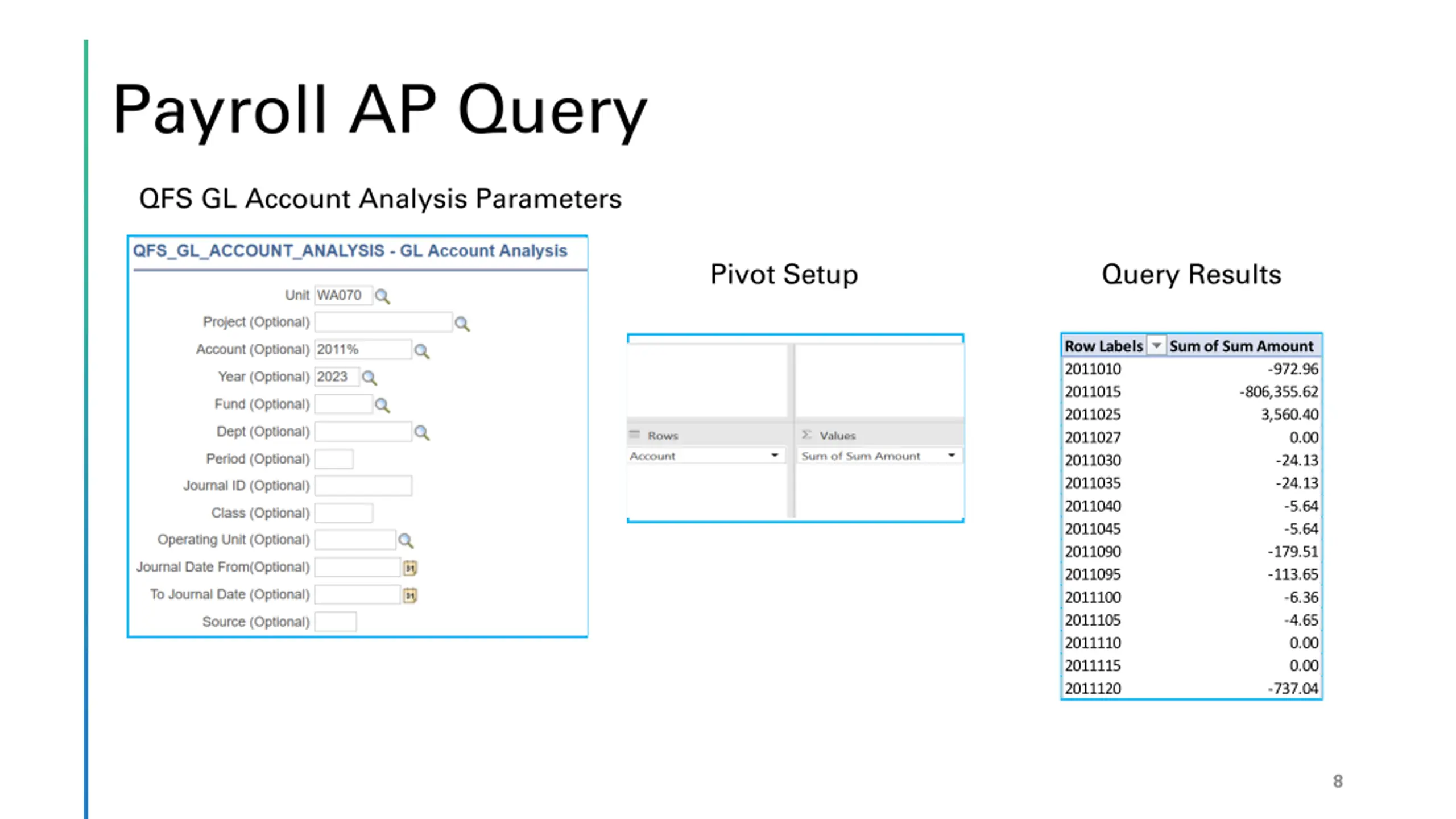 Payroll AP Query QFS GL Account Analysis Parameters Pivot Setup Query Results Row Labels 2011010 2011015 2011025 2011027 2011030 2011035 2011040 2011045 2011090 2011095 2011100 2011105 2011110 2011115 2011120 Sum of Sum Amount -972.96 -806,355.62 3,560.40 0.00 -24.13 -24.13 -5.64 -5.64 -179.51 -113.65 -6.36 -4.65 0.00 0.00 -737.04 8