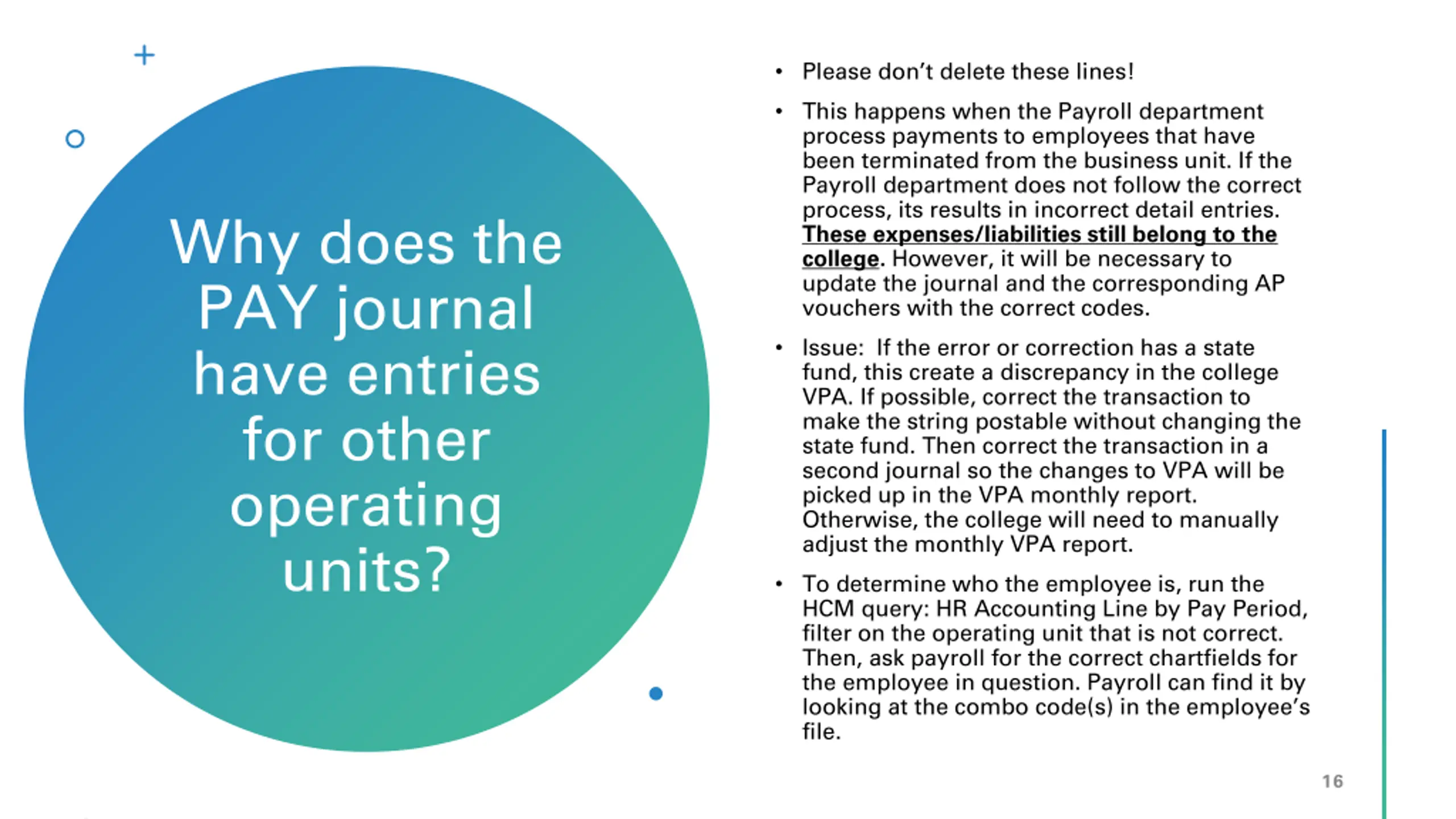 Please dont delete these lines! This happens when the Payroll department process payments to employees that have been terminated from the business unit. If the Payroll department does not follow the correct process, its results in incorrect detail entries. These expenses/liabilities still belong to the college. However, it will be necessary to update the journal and the corresponding AP vouchers with the correct codes. Why does the PAY journal have entries for other operating units? Issue: If the error or correction has a state fund, this create a discrepancy in the college VPA. If possible, correct the transaction to make the string postable without changing the state fund. Then correct the transaction in a second journal so the changes to VPA will be picked up in the VPA monthly report. Otherwise, the college will need to manually adjust the monthly VPA report. To determine who the employee is, run the HCM query: HR Accounting Line by Pay Period, filter on the operating unit that is not correct. Then, ask payroll for the correct chartfields for the employee in question. Payroll can find it by looking at the combo code(s) in the employee s file. 16