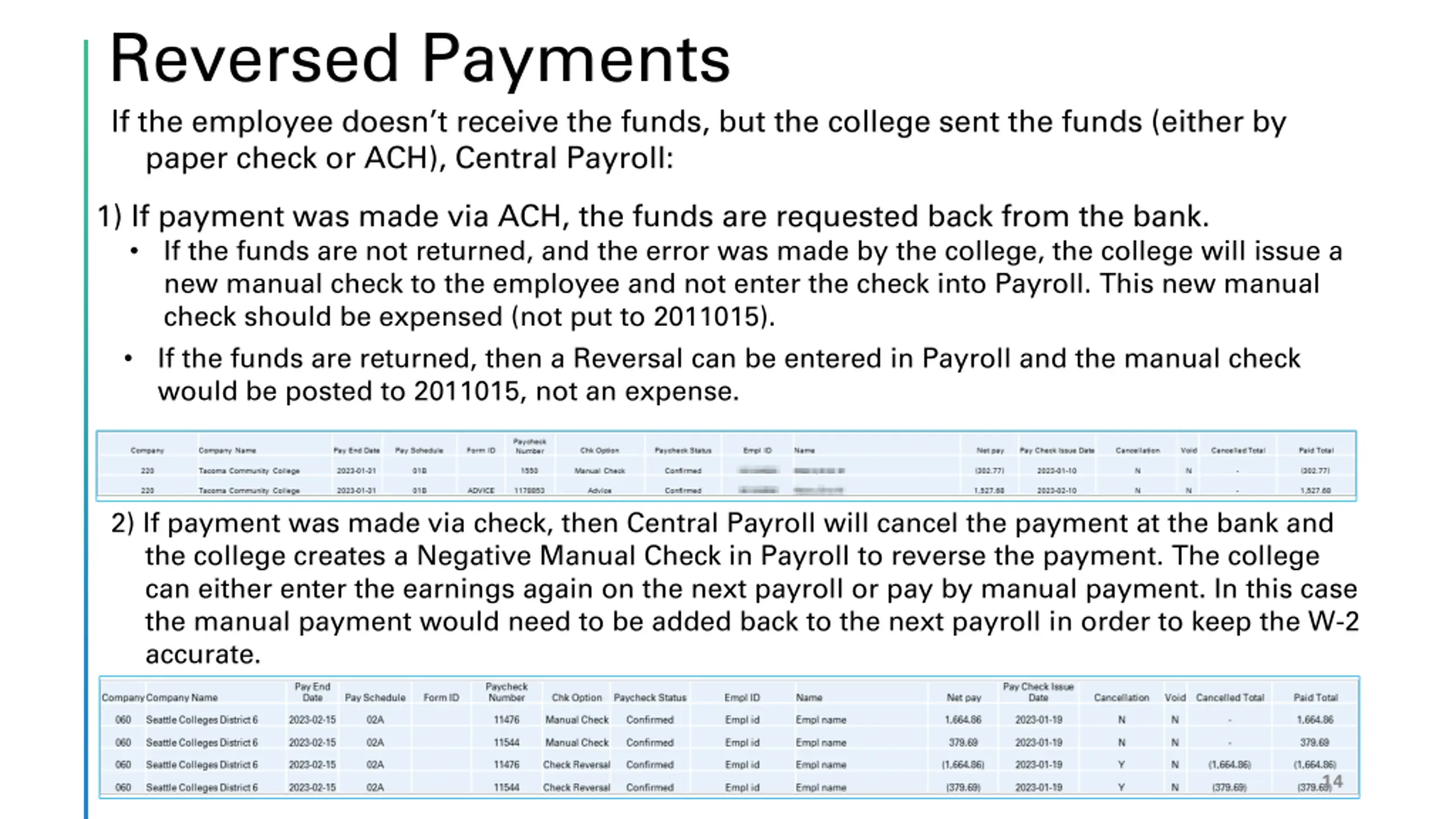 Reversed Payments If the employee doesn t receive the funds, but the college sent the funds (either by paper check or ACH), Central Payroll: 1) If payment was made via ACH, the funds are requested back from the bank. If the funds are not returned, and the error was made by the college, the college will issue a new manual check to the employee and not enter the check into Payroll. This new manual check should be expensed (not put to 2011015). If the funds are returned, then a Reversal can be entered in Payroll and the manual check would be posted to 2011015, not an expense. 2) If payment was made via check, then Central Payroll will cancel the payment at the bank and the college creates a Negative Manual Check in Payroll to reverse the payment. The college can either enter the earnings again on the next payroll or pay by manual payment. In this case the manual payment would need to be added back to the next payroll in order to keep the W-2 accurate. 14