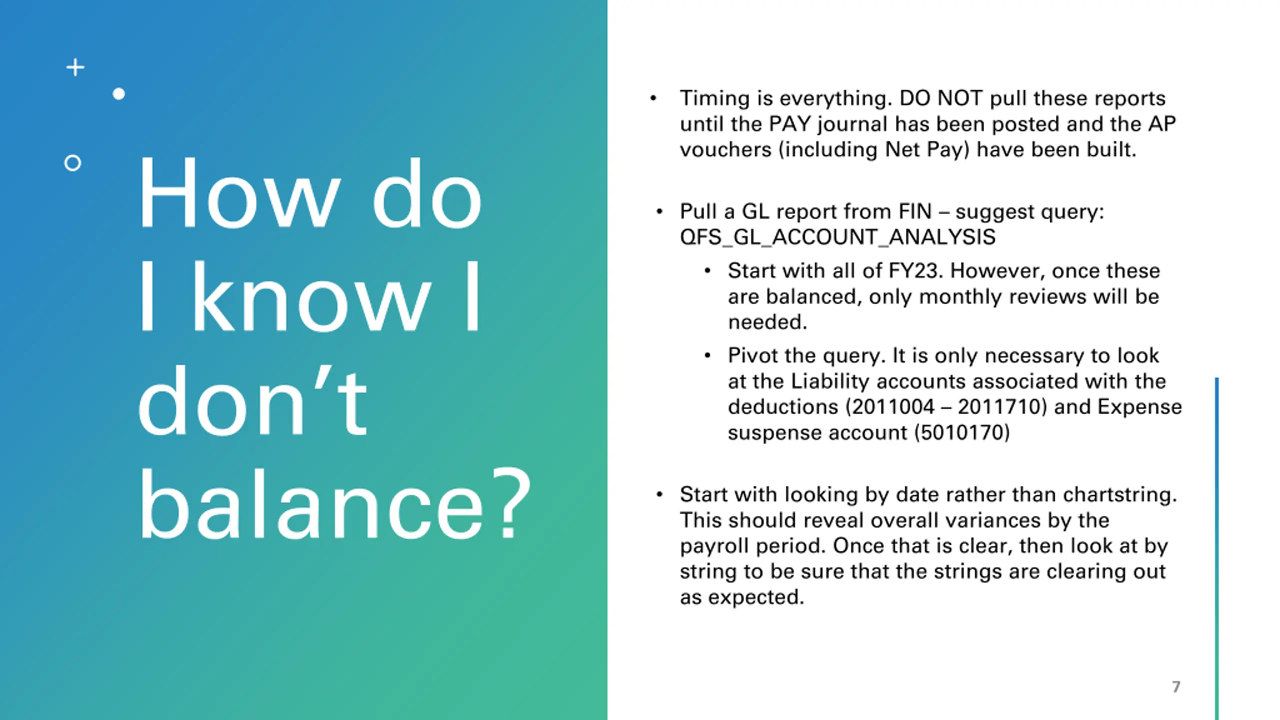 Timing is everything. DO NOT pull these reports until the PAY journal has been posted and the AP vouchers (including Net Pay) have been built. How do I know I don t balance? Pull a GL report from FIN suggest query: QFS_GL_ACCOUNT_ANALYSIS Start with all of FY23. However, once these are balanced, only monthly reviews will be needed. Pivot the query. It is only necessary to look at the Liability accounts associated with the deductions (2011004 2011710) and Expense suspense account (5010170) Start with looking by date rather than chartstring. This should reveal overall variances by the payroll period. Once that is clear, then look at by string to be sure that the strings are clearing out as expected. 7