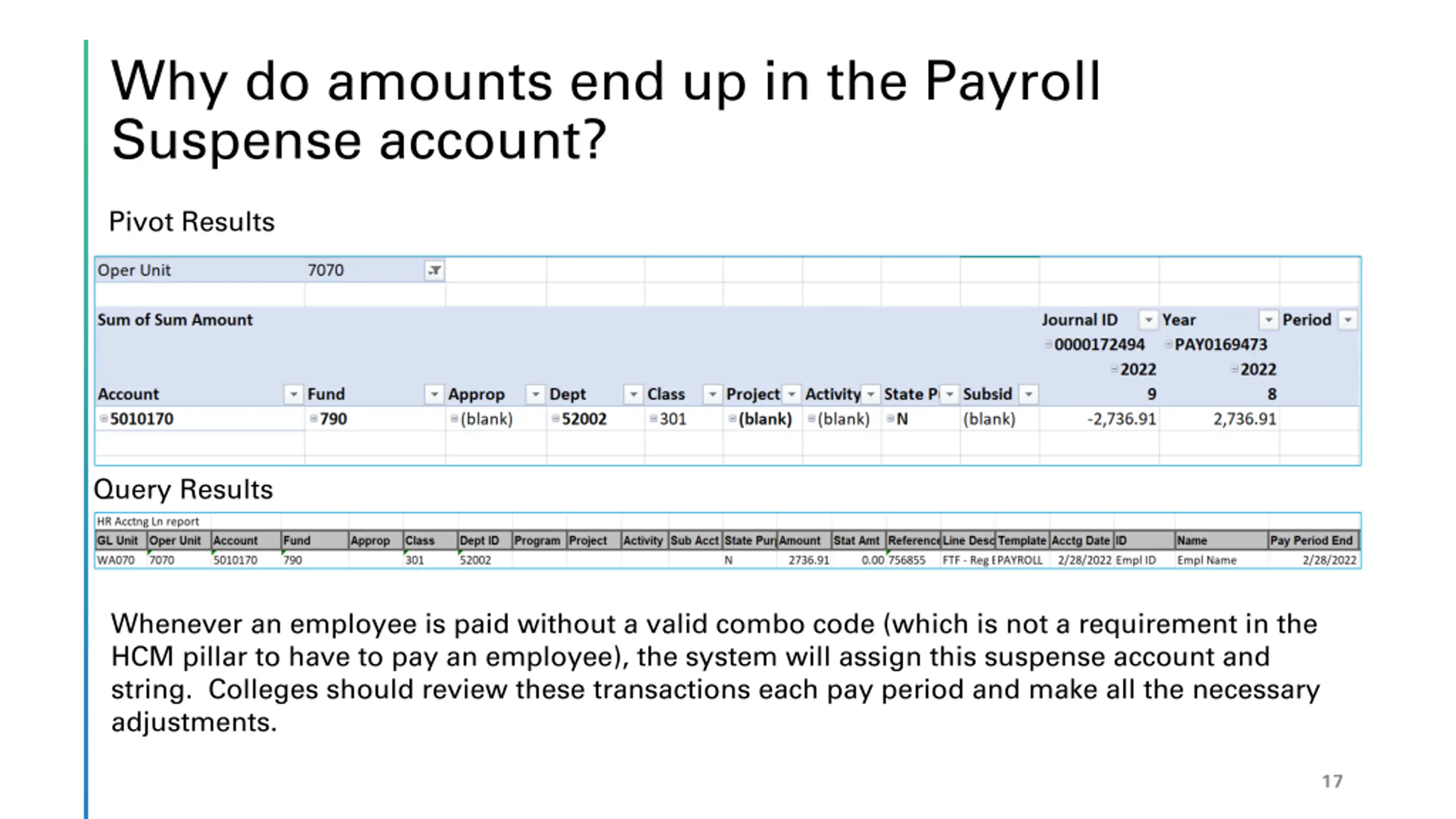 Why do amounts end up in the Payroll Suspense account? Pivot Results Query Results Whenever an employee is paid without a valid combo code (which is not a requirement in the HCM pillar to have to pay an employee), the system will assign this suspense account and string. Colleges should review these transactions each pay period and make all the necessary adjustments. 17